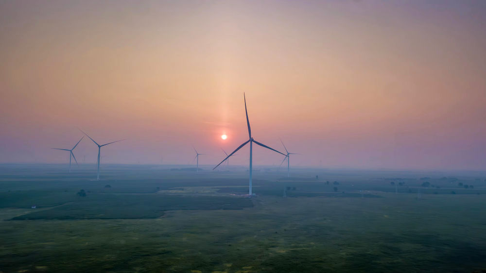 科爾沁大草原上,牛羊健碩。藍(lán)天白云下,一排排巨型“風(fēng)車(chē)”緩緩旋轉(zhuǎn),在古老草原上勾勒出現(xiàn)代的“天際線”。這里是內(nèi)蒙古通遼市238萬(wàn)千瓦風(fēng)電基地。