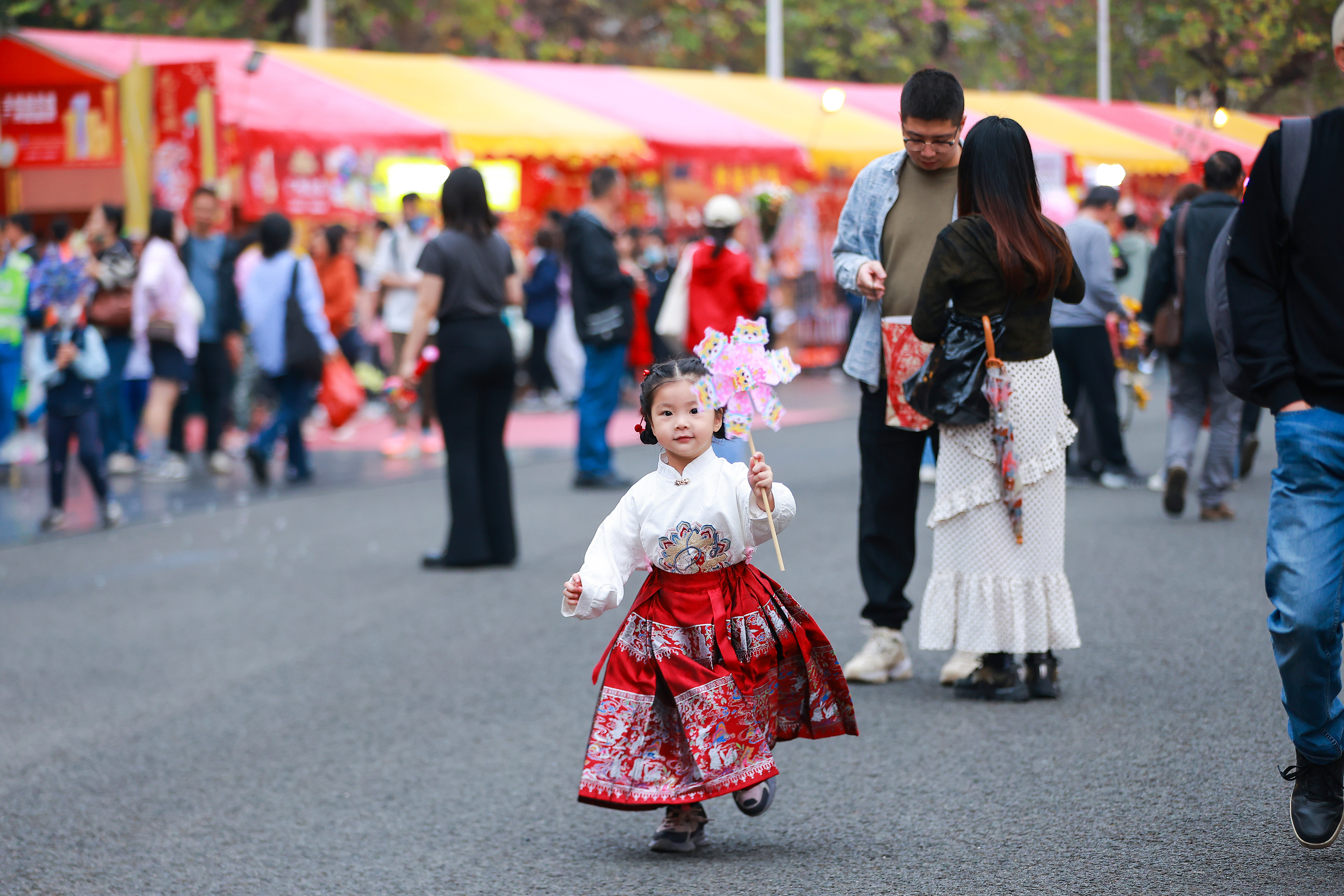 拿著風(fēng)車(chē)穿著馬面裙的小女孩在廣州的花市上開(kāi)心奔跑。