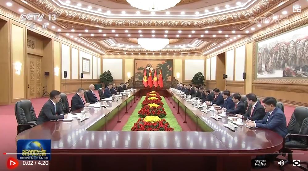習近平指出,堅持共產(chǎn)黨領(lǐng)導和社會主義制度是中越兩國最本質(zhì)的特征,也是發(fā)展中越關(guān)系最堅實的政治基礎(chǔ)。中方將越南視為周邊外交的優(yōu)先方向,愿同越方一道,在深化高水平互利合作上走在前列,在維護國際公平正義上走在前列,在推動人類進步事業(yè)上走在前列,攜手構(gòu)建具有戰(zhàn)略意義的中越命運共同體。