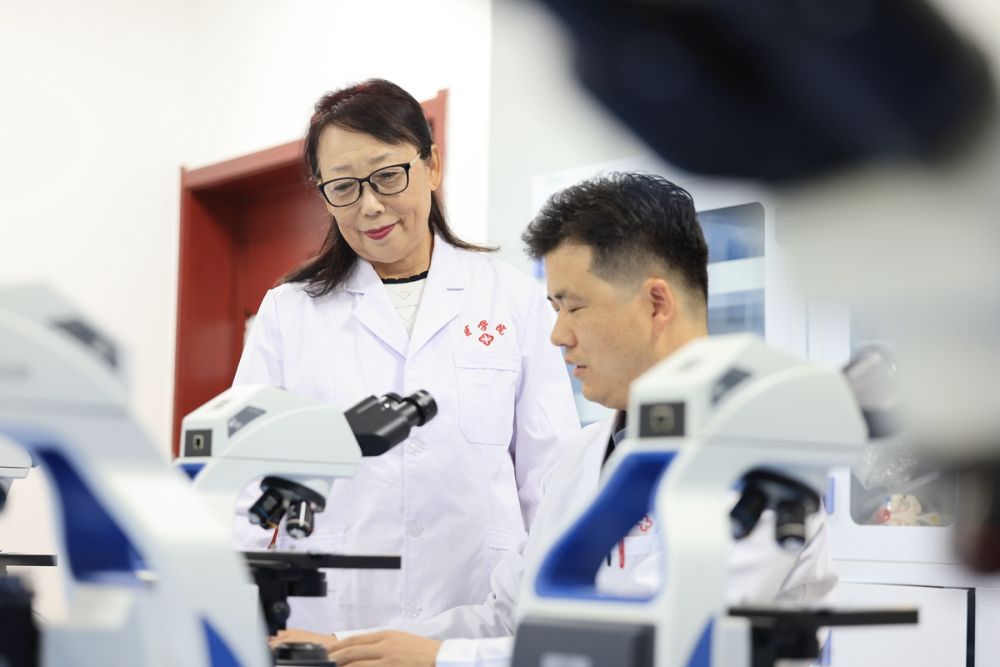 崔麗在輔導(dǎo)青年教師觀察組織切片標(biāo)本。(方衛(wèi)東 攝)