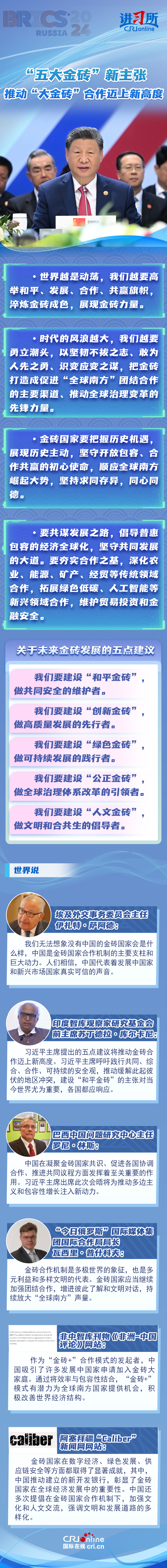 “時(shí)代的風(fēng)浪越大,我們?cè)揭铝⒊鳖^,以堅(jiān)韌不拔之志、敢為人先之勇、識(shí)變應(yīng)變之謀,把金磚打造成促進(jìn)‘全球南方’團(tuán)結(jié)合作的主要渠道、推動(dòng)全球治理變革的先鋒力量?!碑?dāng)?shù)貢r(shí)間10月23日,習(xí)近平主席在俄羅斯喀山出席金磚國(guó)家領(lǐng)導(dǎo)人第十六次會(huì)晤并發(fā)表重要講話,提出共建“和平金磚”“創(chuàng)新金磚”“綠色金磚”“公正金磚”“人文金磚”,為“大金磚合作”擘畫藍(lán)圖。