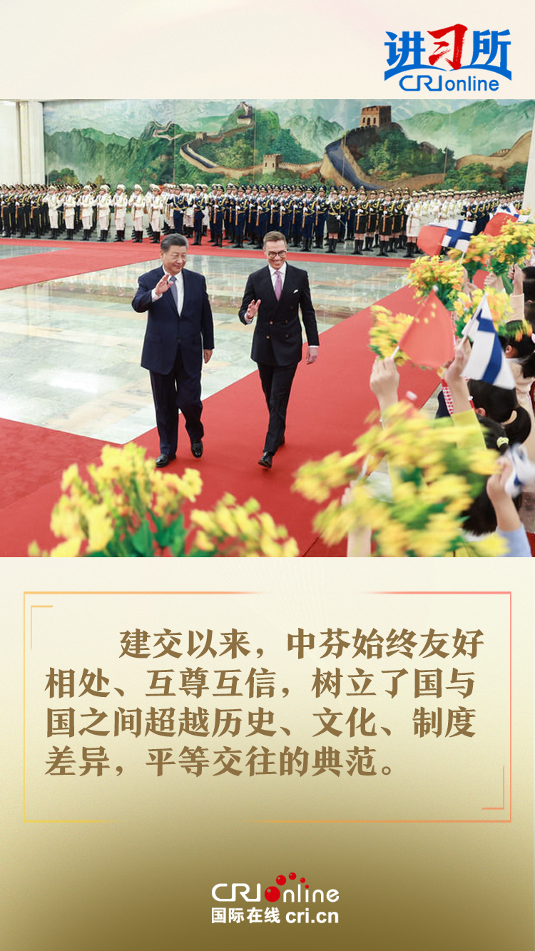 習(xí)近平指出,建交以來,中芬始終友好相處、互尊互信,樹立了國與國之間超越歷史、文化、制度差異,平等交往的典范。中方愿同芬方一道,加強(qiáng)戰(zhàn)略合作,弘揚(yáng)友好傳統(tǒng),將中芬面向未來的新型合作伙伴關(guān)系進(jìn)一步推向前進(jìn),更好造福兩國和兩國人民,為世界和平和發(fā)展作出新貢獻(xiàn)。