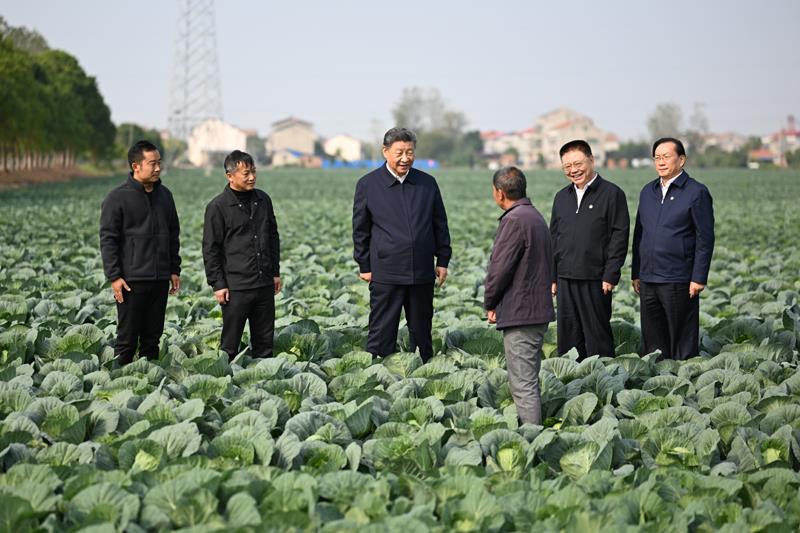 2024年11月5日,習(xí)近平總書記在湖北省咸寧市嘉魚縣潘家灣鎮(zhèn)十里蔬菜長廊考察時,同菜農(nóng)親切交流。