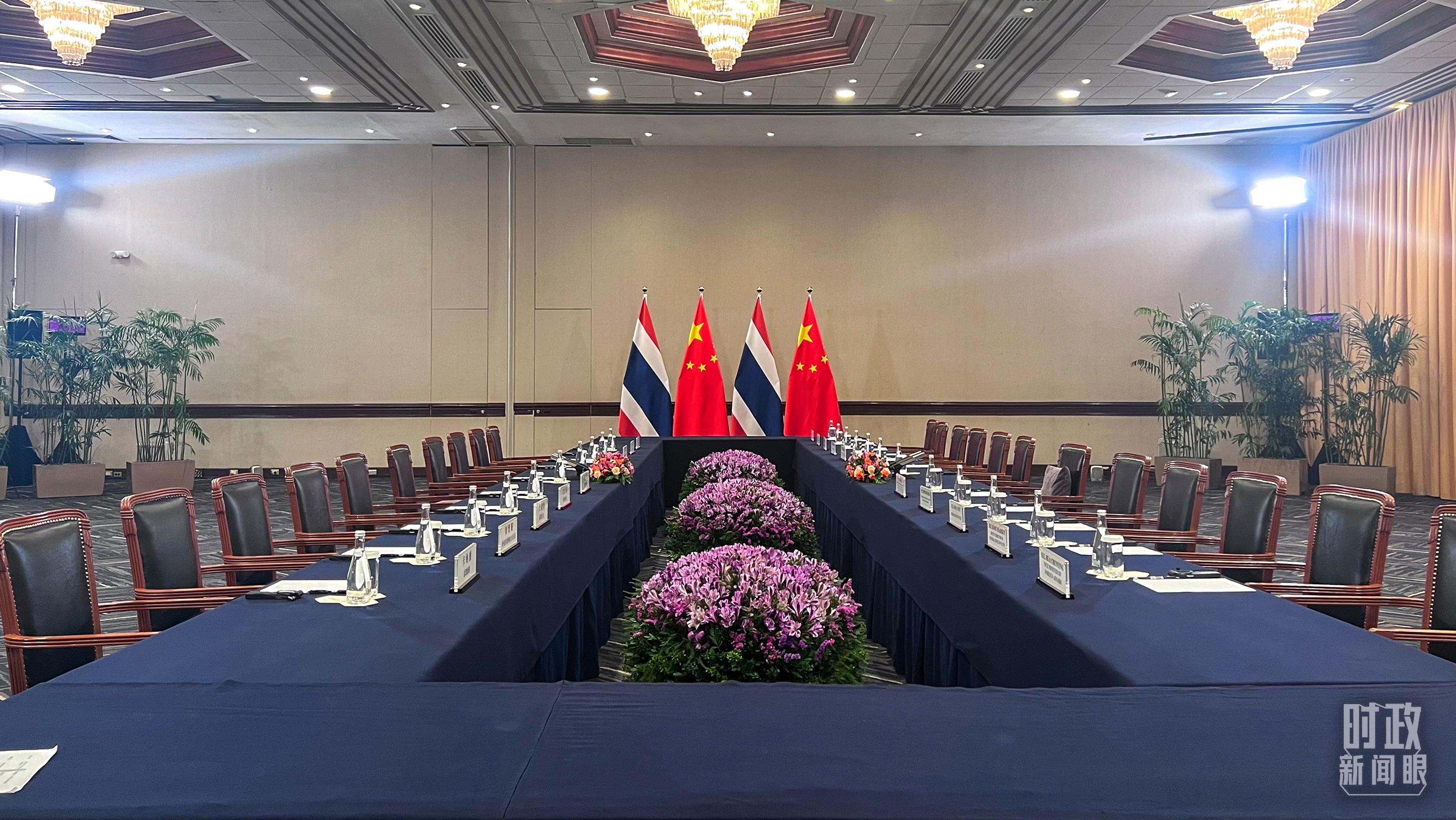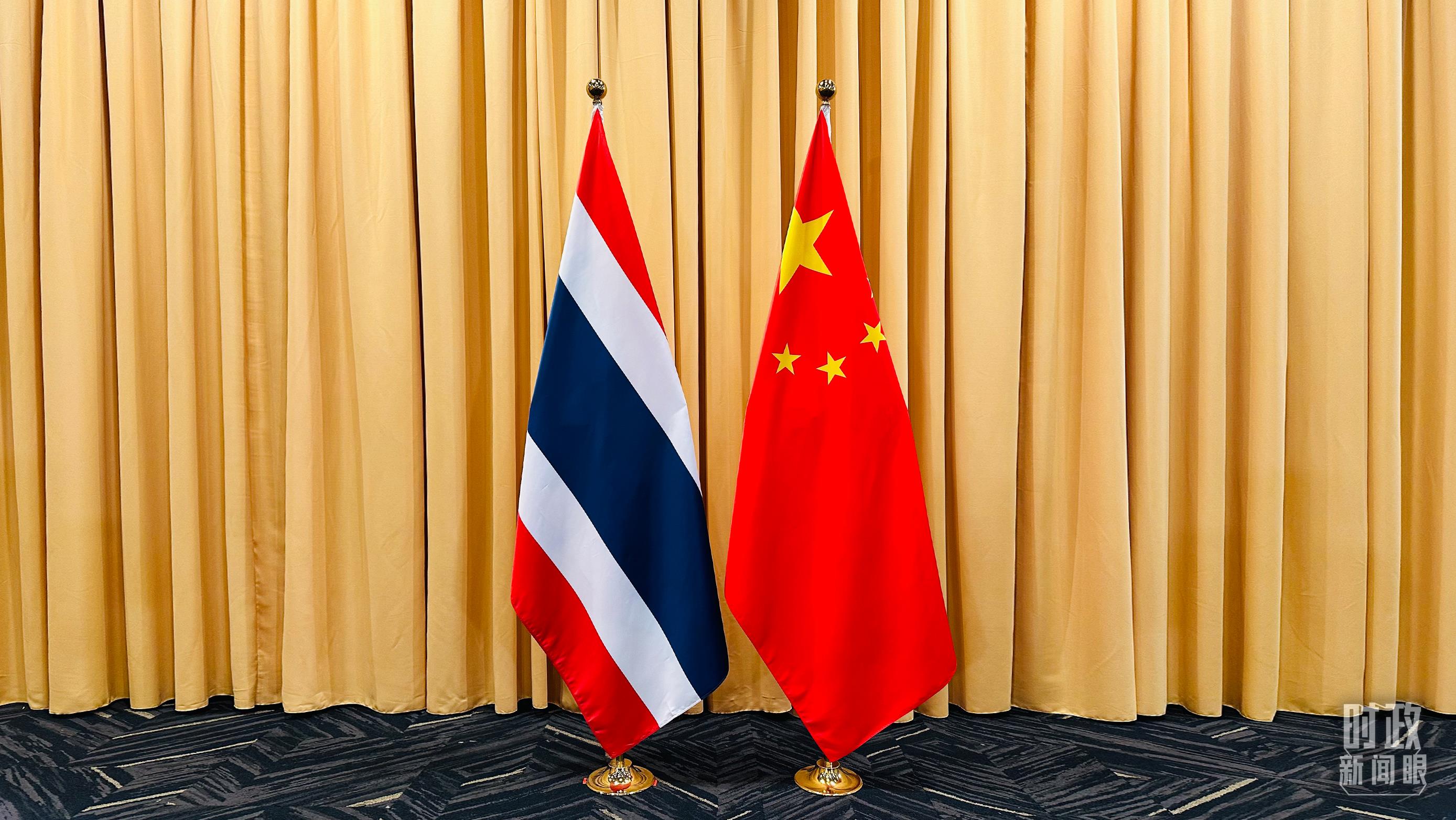 會(huì)見(jiàn)現(xiàn)場(chǎng)的中泰兩國(guó)國(guó)旗。(總臺(tái)央視記者范一鳴拍攝)