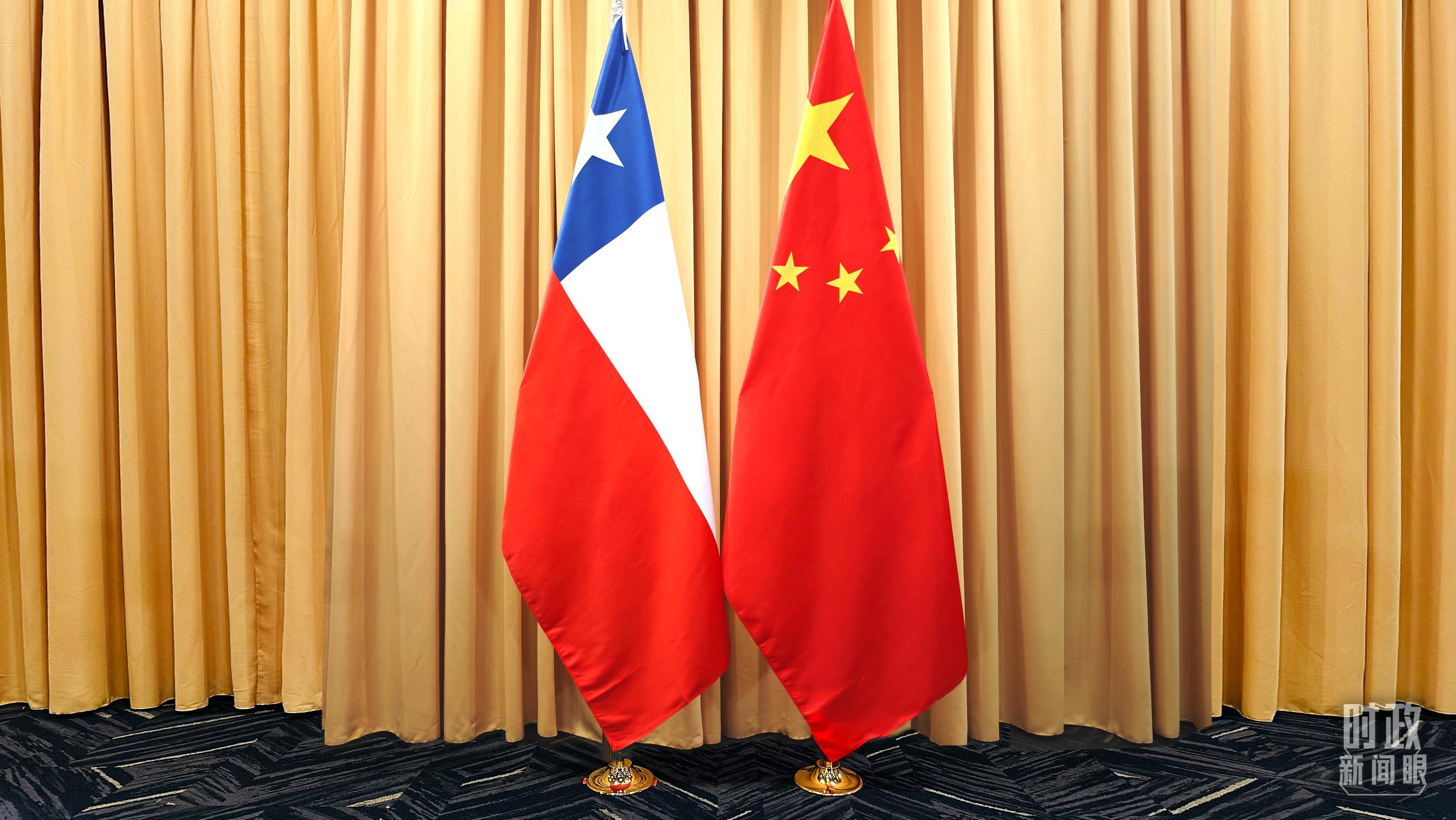 會(huì)見(jiàn)現(xiàn)場(chǎng)的中智兩國(guó)國(guó)旗。(總臺(tái)央視記者耿小龍拍攝)