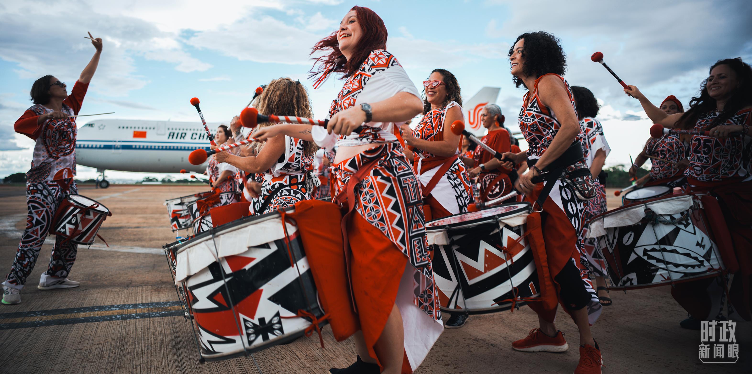 習(xí)主席乘專機抵達巴西利亞,藝術(shù)家演奏特色鼓樂。(總臺央視記者彭漢明拍攝)