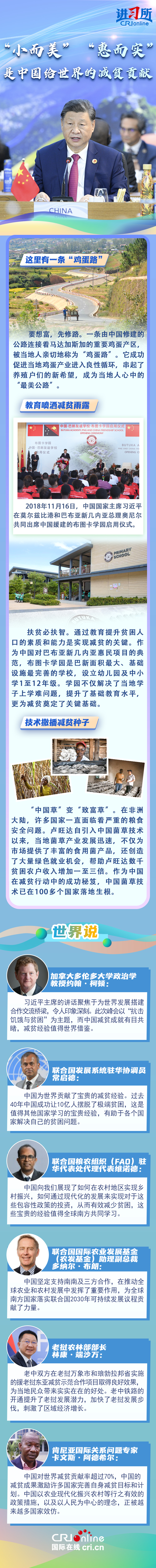“世界繁榮穩(wěn)定不可能建立在貧者愈貧、富者愈富的基礎(chǔ)之上。”近年來,中國一直在用實際行動與世界分享脫貧經(jīng)驗:與東盟國家共同開展鄉(xiāng)村減貧推進計劃,在非洲開展基礎(chǔ)設施建設和農(nóng)業(yè)、醫(yī)療等技術(shù)合作援助項目,在拉美援建農(nóng)業(yè)技術(shù)中心......一批批“小而美”“惠而實”的民生項目落地生根,幫助當?shù)孛癖姅[脫貧困。多國人士表示,中國成功打贏脫貧攻堅戰(zhàn)具有世界意義,不僅為發(fā)展中國家提供了借鑒經(jīng)驗,更有助于推動建設一個共同發(fā)展的公正世界。