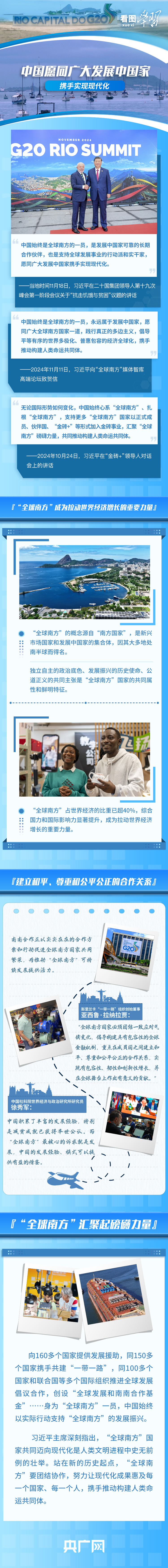 當(dāng)?shù)貢r(shí)間11月18日,習(xí)近平主席在G20峰會(huì)第一階段會(huì)議就“抗擊饑餓與貧困”議題發(fā)表重要講話,呼吁作為世界主要大國領(lǐng)導(dǎo)人應(yīng)該秉持命運(yùn)共同體意識(shí),扛起歷史責(zé)任、展現(xiàn)歷史主動(dòng)、推動(dòng)歷史進(jìn)步。習(xí)主席表示,中國始終是“全球南方”的一員,是發(fā)展中國家可靠的長期合作伙伴,并宣布中國支持全球發(fā)展的八項(xiàng)行動(dòng),愿同各方一道行動(dòng),建設(shè)一個(gè)共同發(fā)展的公正世界。
