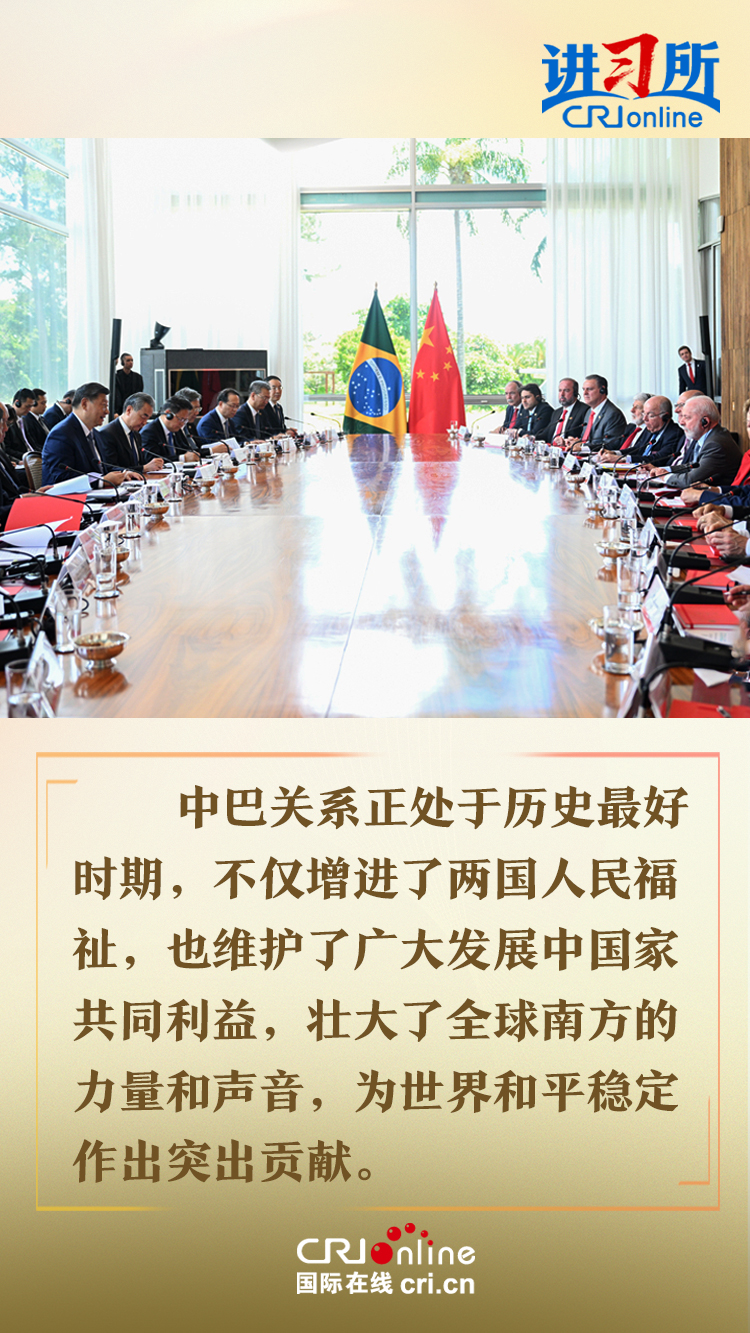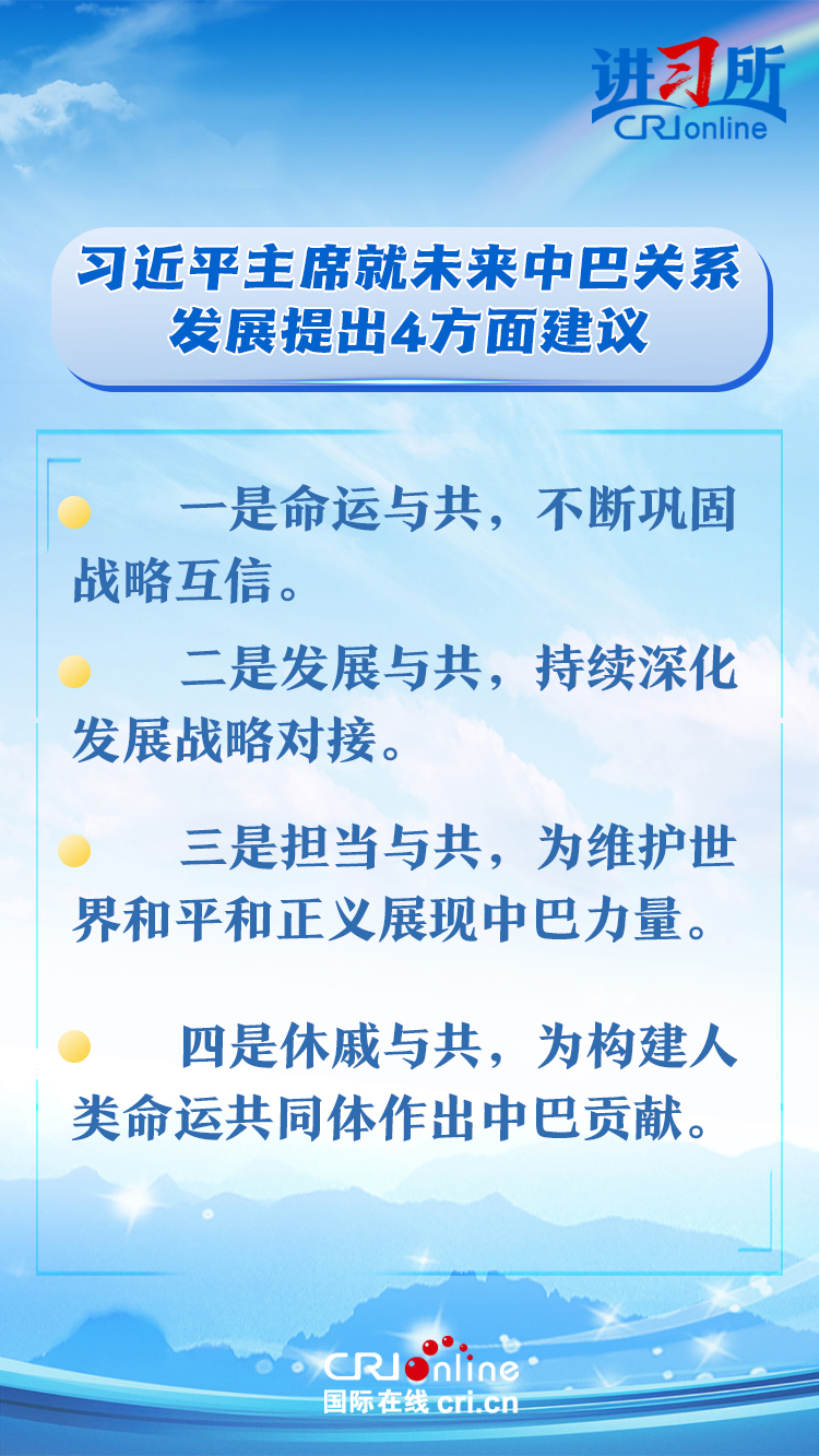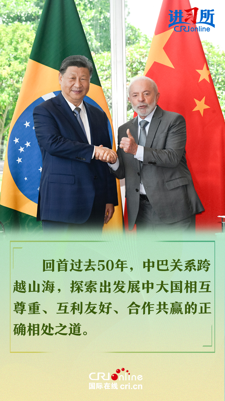 今年是中巴建交50周年。習(xí)近平指出,回首過去50年,中巴關(guān)系跨越山海,探索出發(fā)展中大國相互尊重、互利友好、合作共贏的正確相處之道。中方愿同巴方一道,以人類前途為懷、以人民福祉為念,不斷豐富新時代中巴關(guān)系內(nèi)涵,做相互成就的“黃金搭檔”,朝著構(gòu)建人類命運共同體、構(gòu)建更公正世界和更可持續(xù)星球的目標不斷邁進,為人類和平和進步事業(yè)作出更大貢獻。