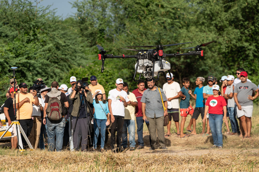 2024年2月2日,在巴西阿波迪,人們觀看一款中國生產的農用無人機。當日,中巴農業(yè)機械化合作示范項目啟動儀式在巴西阿波迪舉行,第一批來自中國7家農機企業(yè)共31臺(件)設備正式交付給巴西農村勞動者組織。新華社記者 王天聰 攝