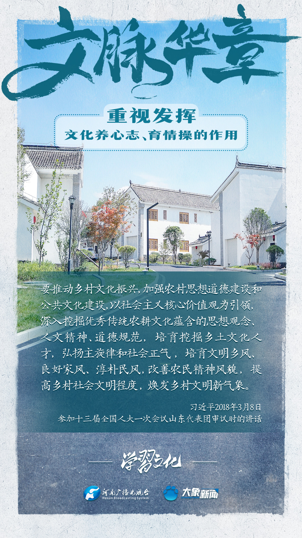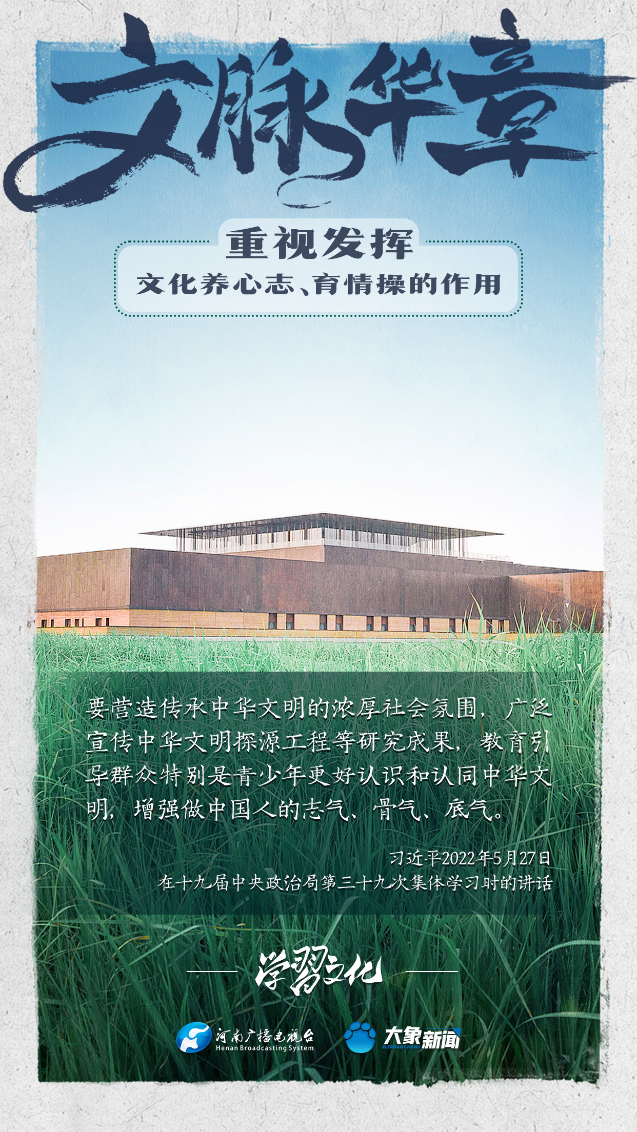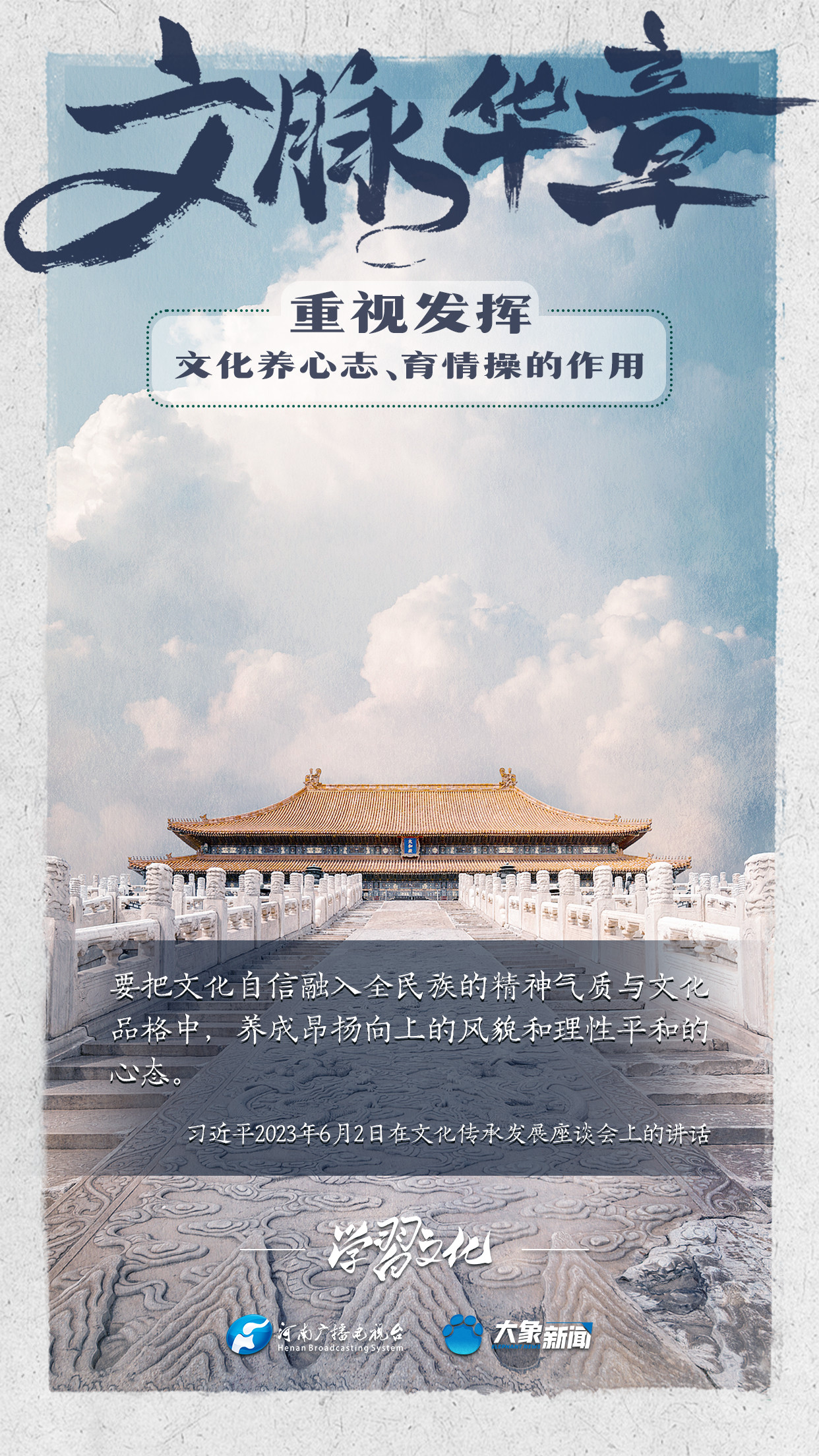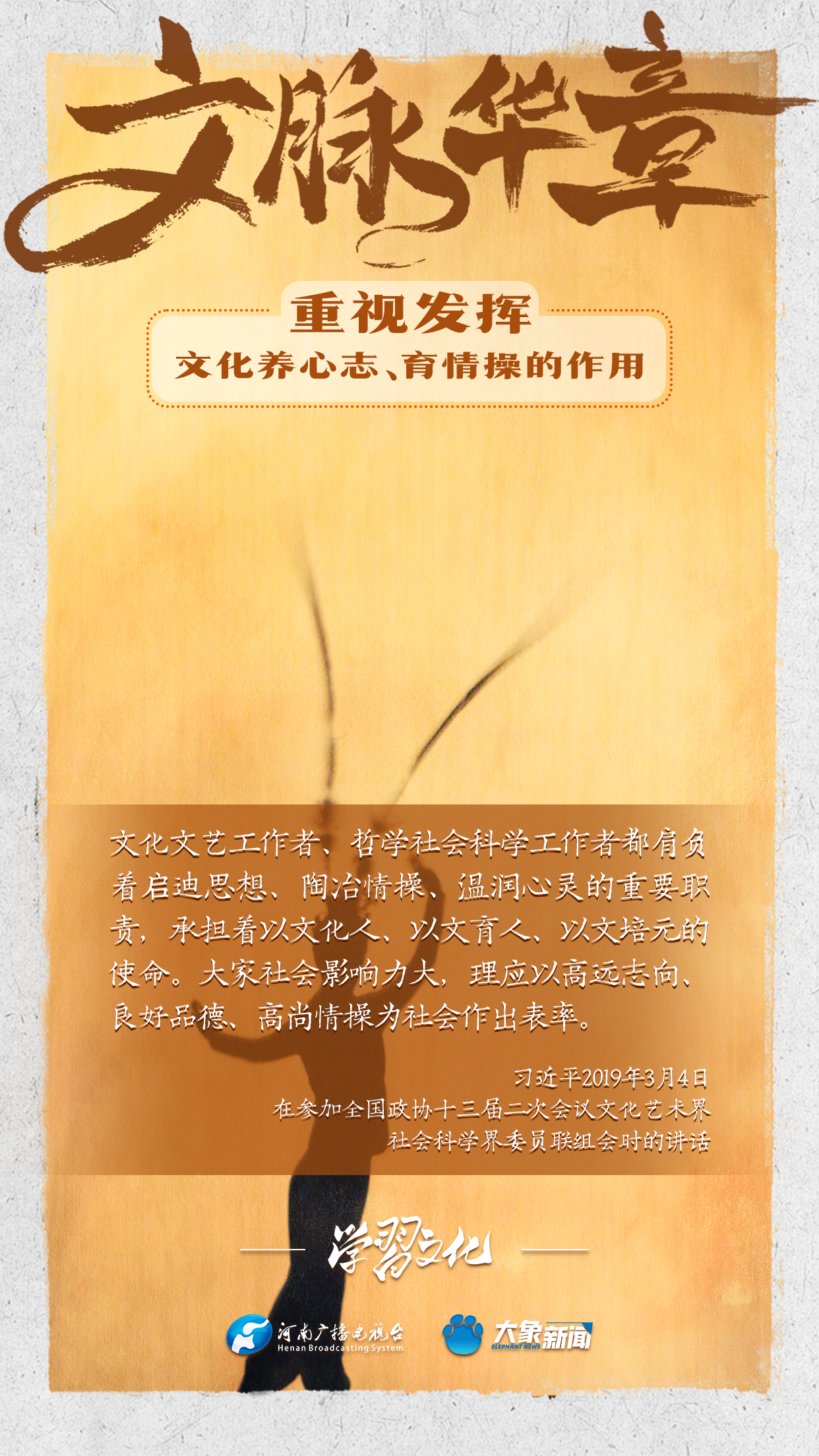 習(xí)近平總書(shū)記在主持中共中央政治局第十七次集體學(xué)習(xí)時(shí)強(qiáng)調(diào),重視發(fā)揮文化養(yǎng)心志、育情操的作用,涵養(yǎng)全民族昂揚(yáng)奮發(fā)的精神氣質(zhì)。總書(shū)記高度重視文化的作用,發(fā)表了一系列重要講話,倡導(dǎo)以文載道、以文傳聲、以文化人。我們一起學(xué)習(xí)。