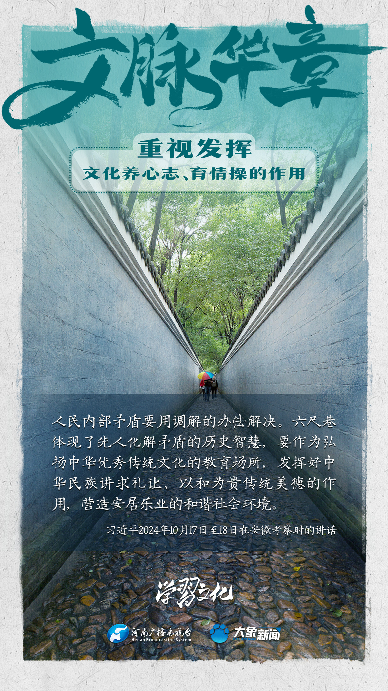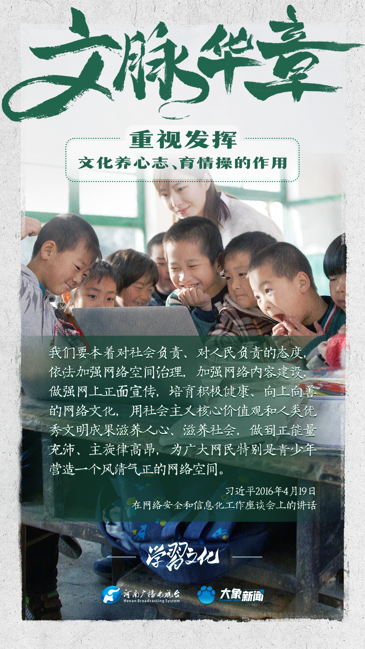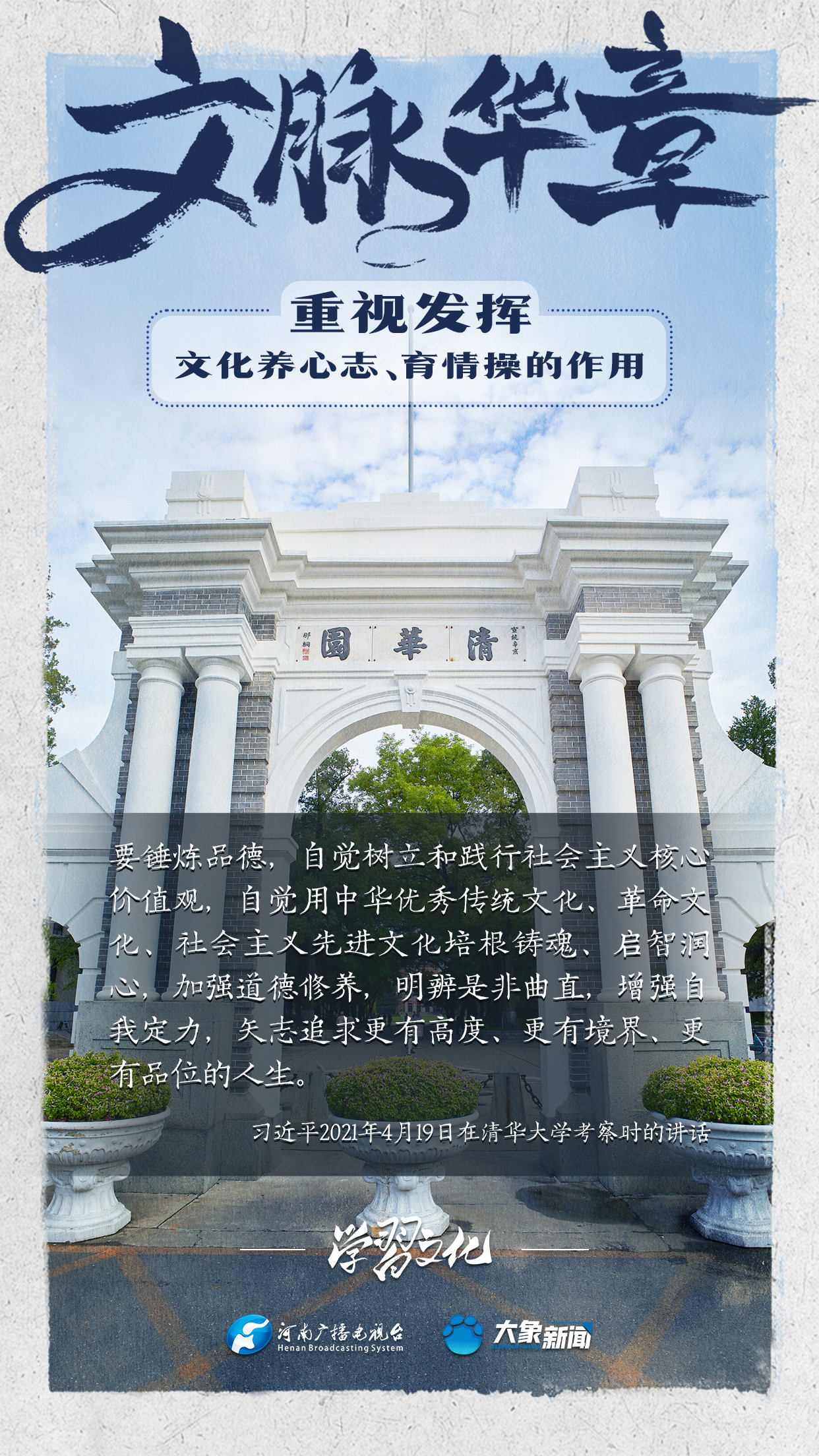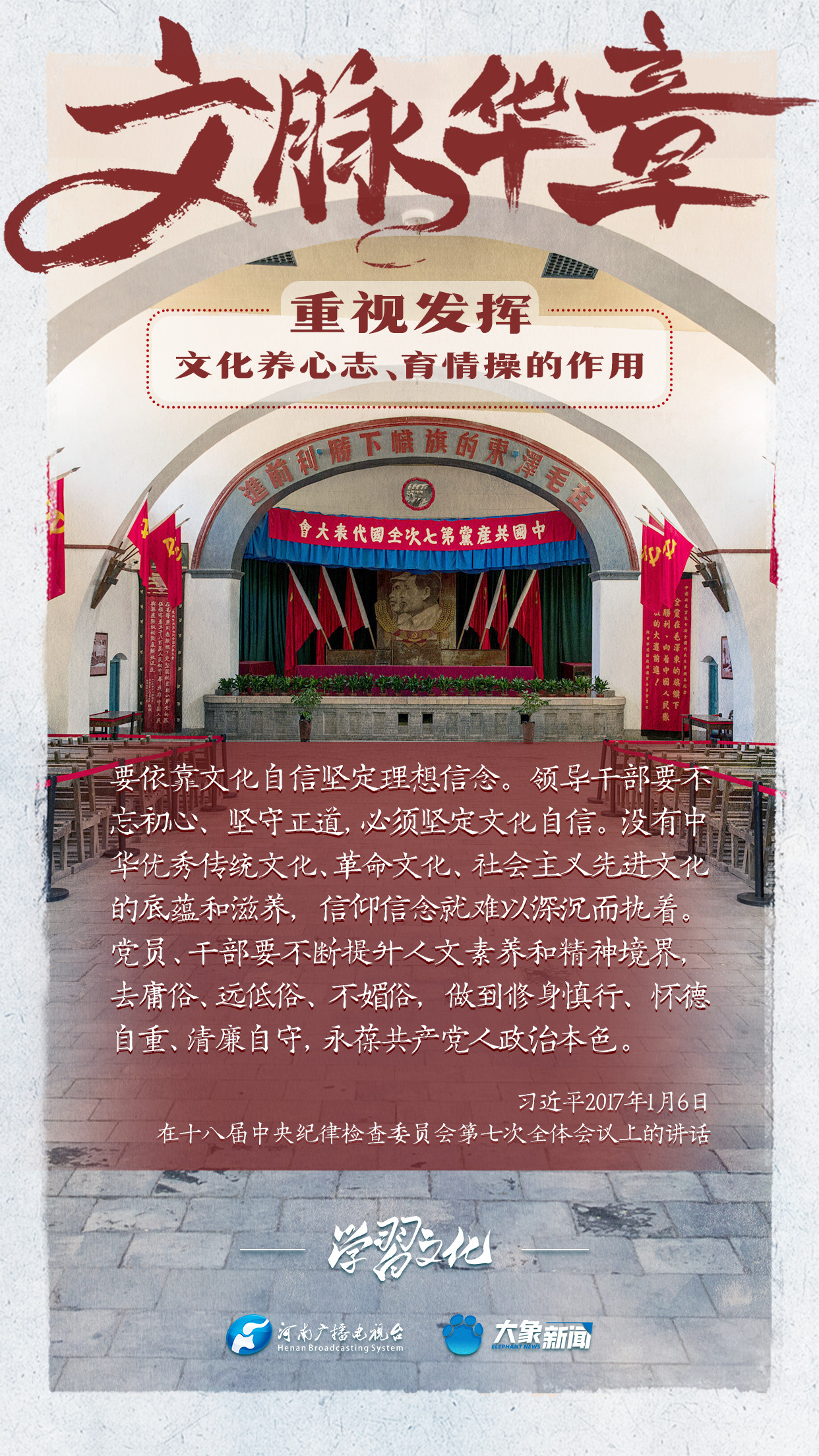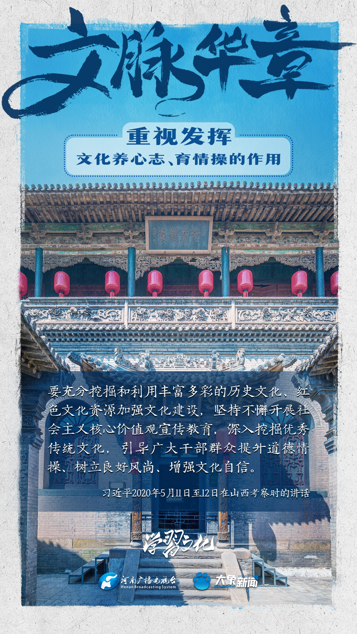 習(xí)近平總書(shū)記在主持中共中央政治局第十七次集體學(xué)習(xí)時(shí)強(qiáng)調(diào),重視發(fā)揮文化養(yǎng)心志、育情操的作用,涵養(yǎng)全民族昂揚(yáng)奮發(fā)的精神氣質(zhì)。總書(shū)記高度重視文化的作用,發(fā)表了一系列重要講話,倡導(dǎo)以文載道、以文傳聲、以文化人。我們一起學(xué)習(xí)。