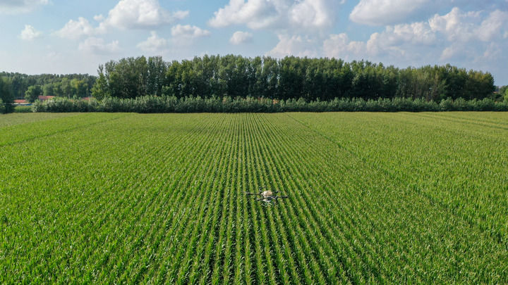 2024年8月8日,在吉林省梨樹縣孤家子鎮(zhèn),無(wú)人機(jī)為作物施肥(無(wú)人機(jī)照片)。新華社記者 張楠 攝
