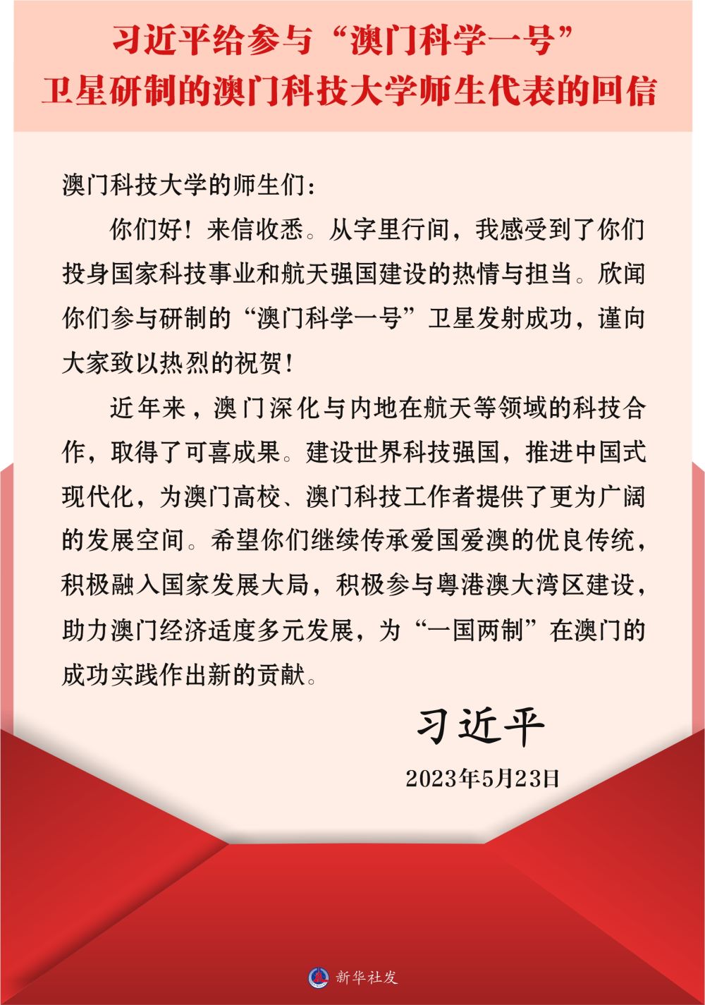 參與衛(wèi)星研制的澳門科技大學(xué)18名師生代表給習(xí)近平主席寫信,匯報(bào)衛(wèi)星成功發(fā)射的喜訊和參與衛(wèi)星研制工作的感受。5月23日,習(xí)近平主席給參與“澳科一號”衛(wèi)星研制的師生代表回信,對他們予以親切勉勵。