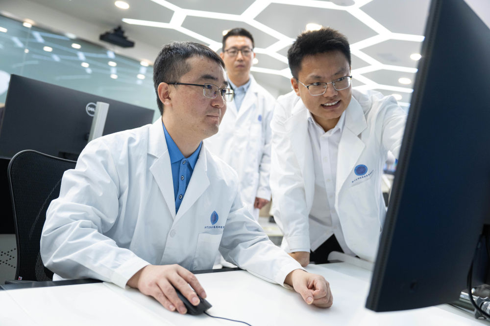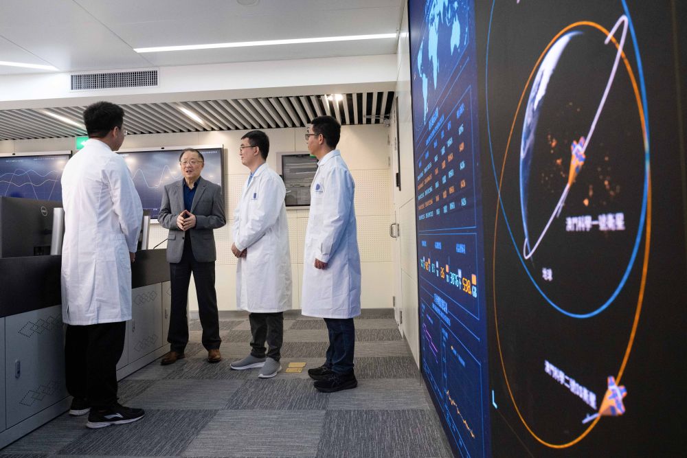 2024年12月4日,“澳科一號”衛(wèi)星項(xiàng)目助理研究員尹亮(左一)與同事交流。