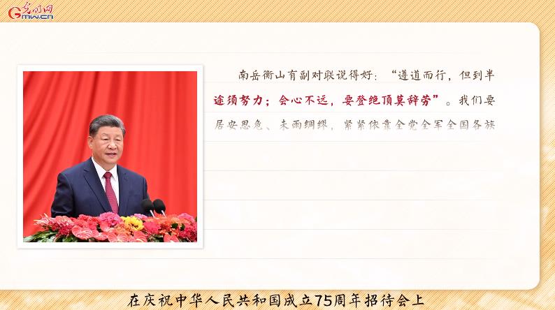 2024年是中華人民共和國成立75周年。9月30日,習近平總書記在慶祝中華人民共和國成立75周年招待會上的講話中引用南岳衡山的一副對聯(lián)“遵道而行,但到半途須努力;會心不遠,要登絕頂莫辭勞”,要求全黨同志居安思危、未雨綢繆,堅決戰(zhàn)勝一切不確定難預料的風險挑戰(zhàn)。