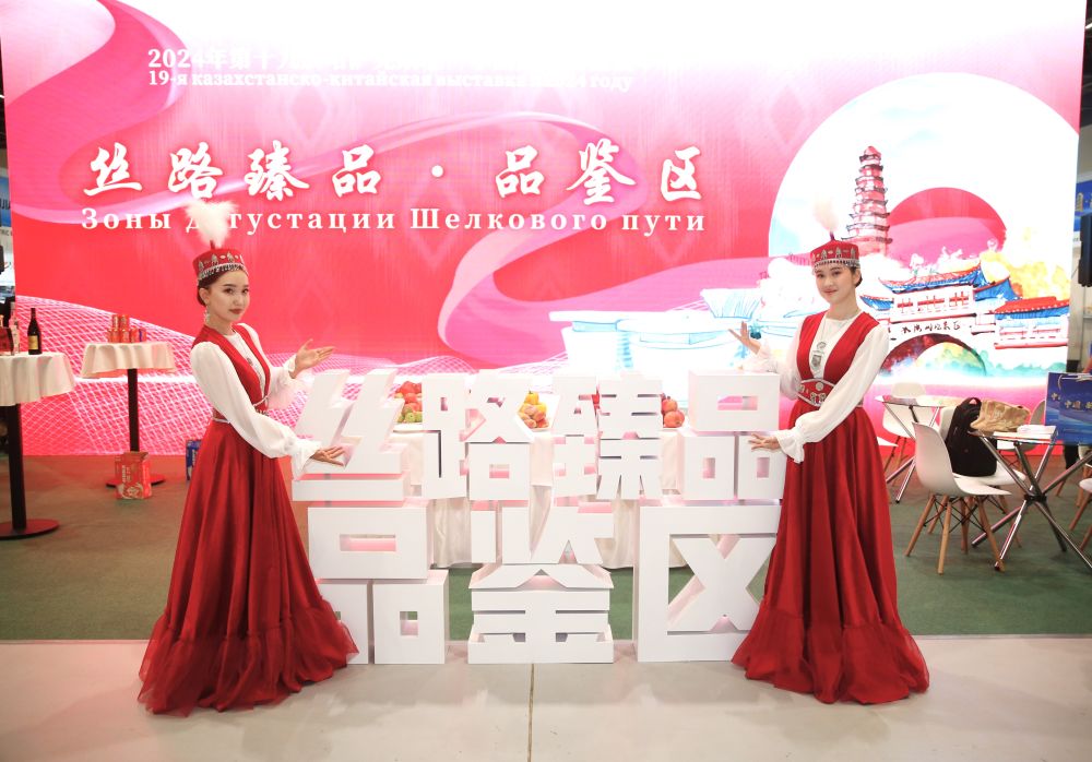 2024年8月23日,在哈薩克斯坦阿斯塔納,身著民族服飾的工作人員在第十九屆哈薩克斯坦—中國(guó)商品展覽會(huì)上歡迎觀展民眾。新華社發(fā)(奧斯帕諾夫攝)