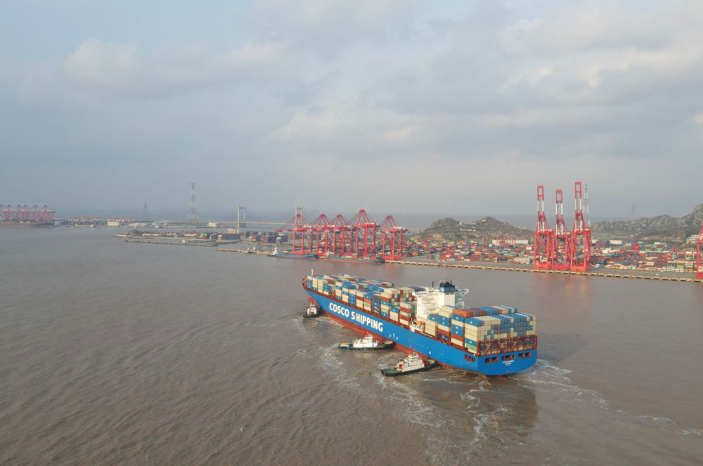 “新上?!陛喌诌_(dá)洋山港,這是自秘魯錢凱港開(kāi)港后首個(gè)“錢凱—上?!闭胶酱危?024年12月18日攝,無(wú)人機(jī)照片)。新華社記者 方喆 攝