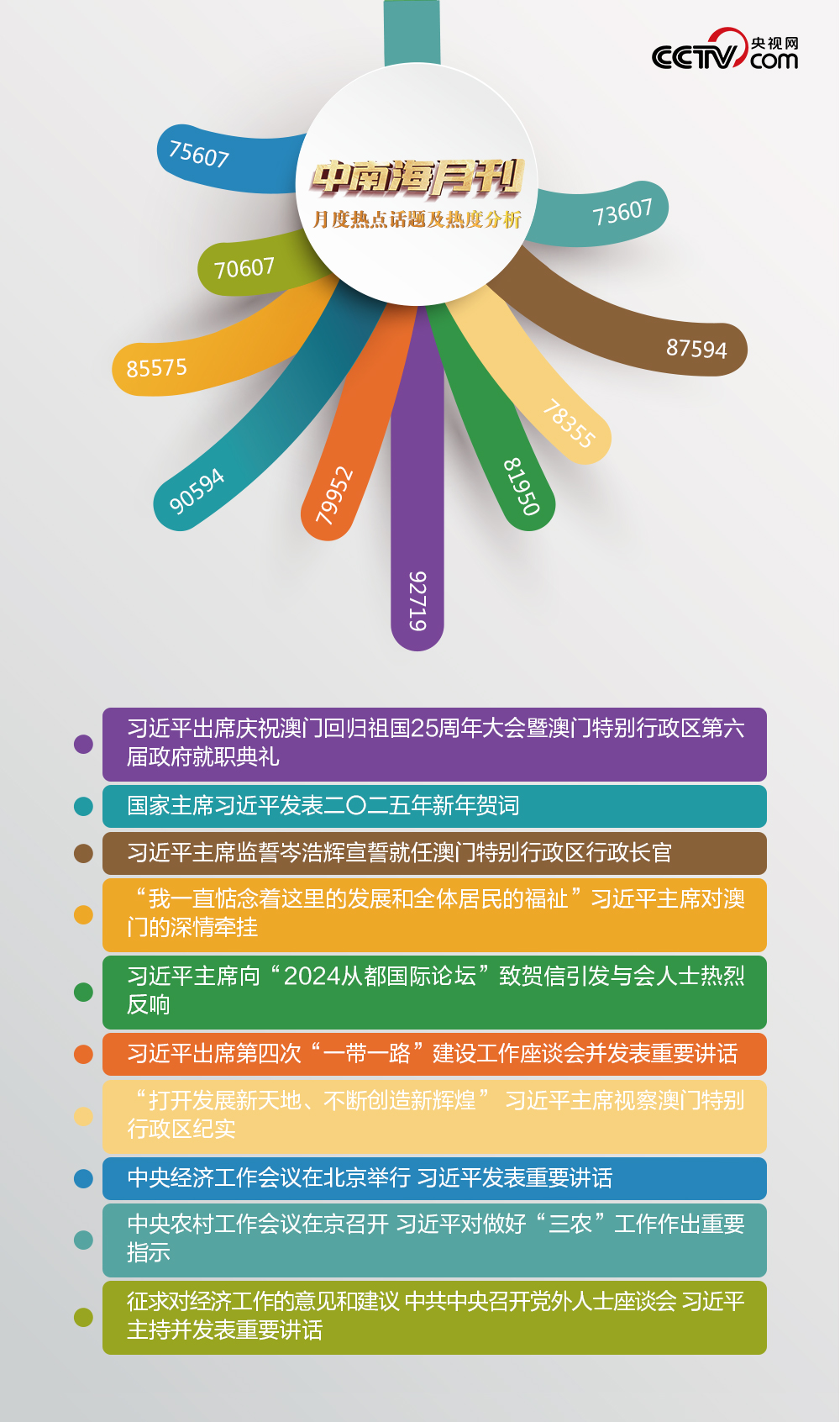 南海風(fēng)起,百舸爭(zhēng)流。盛世蓮花,灼灼生華。央視網(wǎng)“智聞”系統(tǒng)提取分析2024年12月全網(wǎng)時(shí)政新聞熱點(diǎn),習(xí)近平主席澳門之行吸引全網(wǎng)關(guān)注。