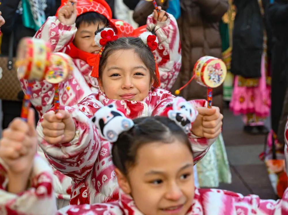 新疆大巴扎社火迎新春,孩子們在現(xiàn)場表演。