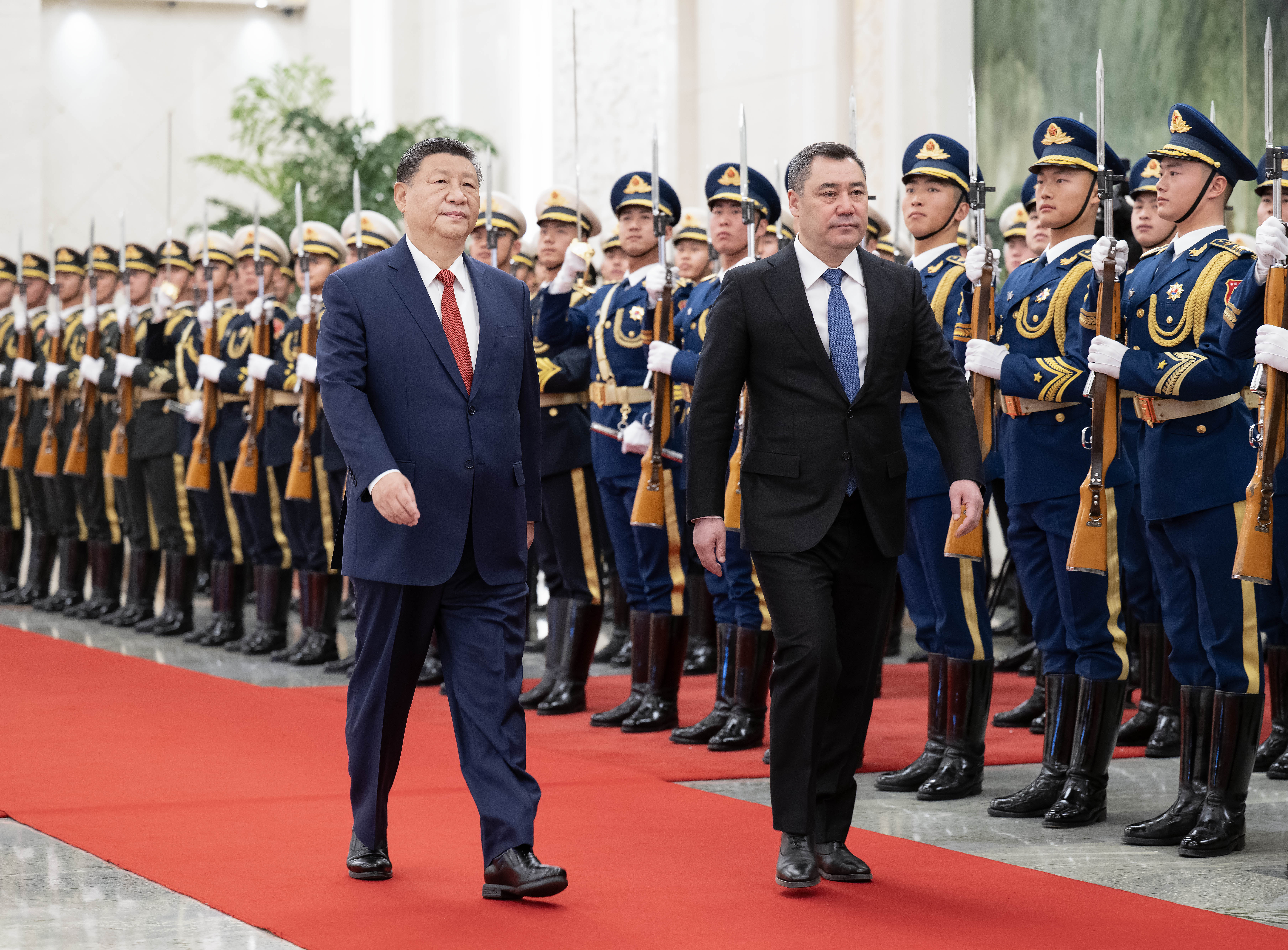 天安門廣場(chǎng)鳴放21響禮炮,禮兵列隊(duì)致敬。兩國(guó)元首登上檢閱臺(tái),軍樂團(tuán)奏中吉兩國(guó)國(guó)歌。扎帕羅夫在習(xí)近平陪同下檢閱中國(guó)人民解放軍儀仗隊(duì),并觀看分列式。
