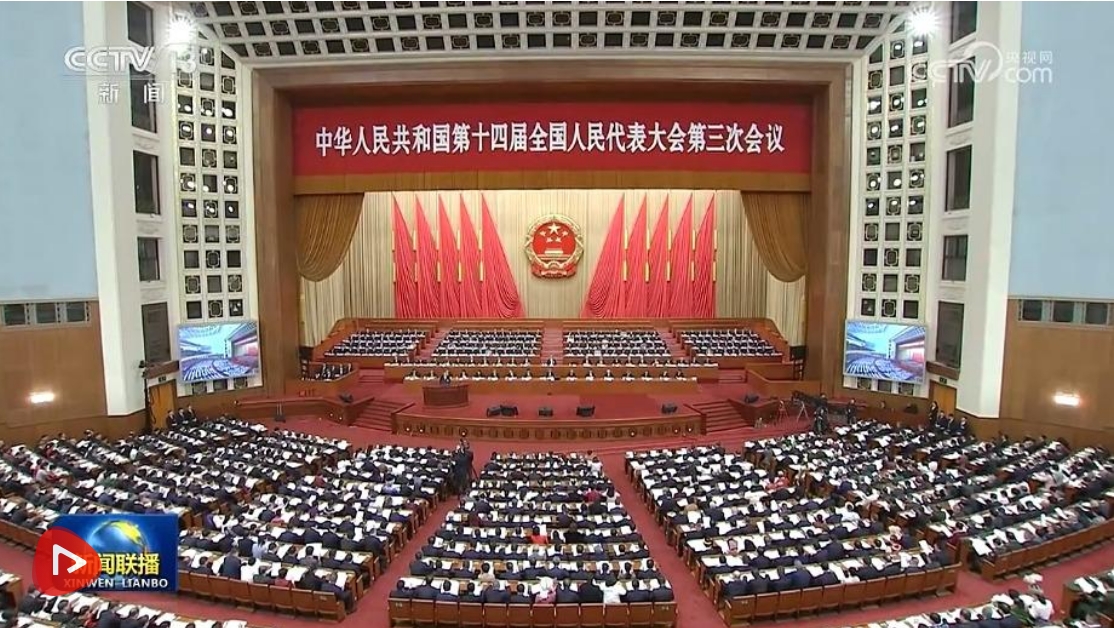 上午9時(shí),趙樂際宣布:中華人民共和國第十四屆全國人民代表大會第三次會議開幕。會場全體起立,高唱國歌。