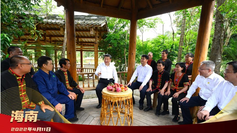 2022年4月,總書記來到海南五指山市水滿鄉(xiāng)毛納村考察調(diào)研。村寨涼亭里,鄉(xiāng)親們正議農(nóng)事。