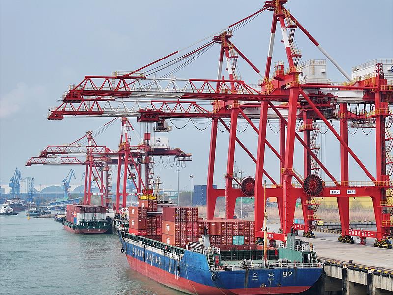 江蘇揚州港,貨輪靠泊在港口裝卸貨物。
