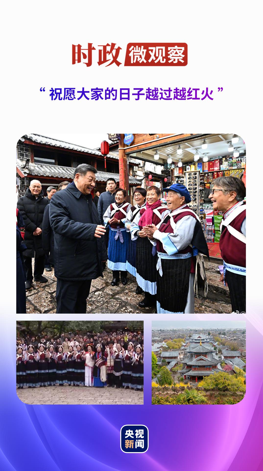 今年3月19日,習(xí)近平總書記再次來到云南考察,在麗江古城沿著石板路邊走邊看,不時停下腳步同大家親切交流。古城居民和游客見到總書記十分興奮,爭相問好,有的還彈奏樂器、載歌載舞歡迎總書記。習(xí)近平總書記祝福大家,“希望你們的生活幸福安康,就像納西族的大姓‘和’姓一樣,和和美美”。