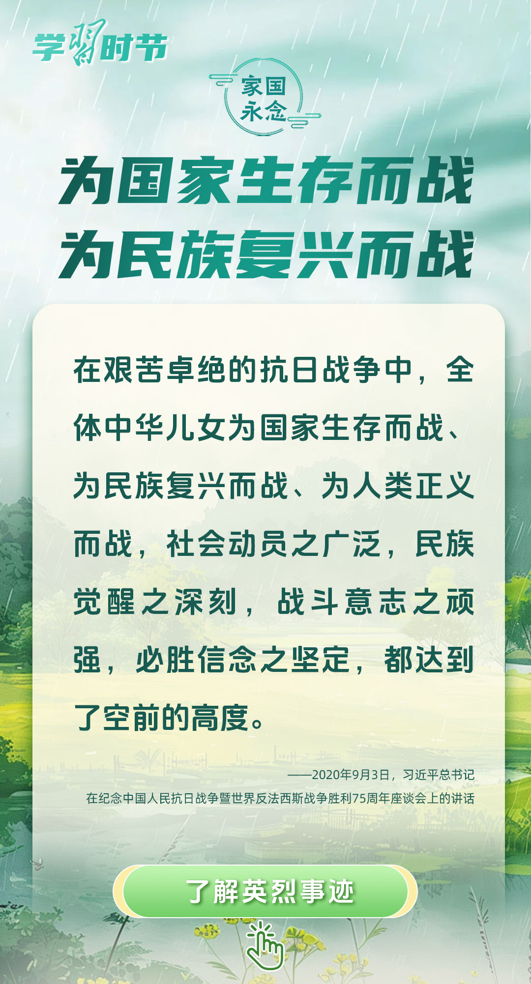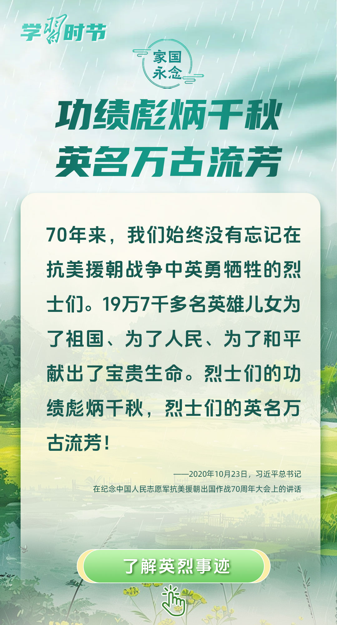 今年是中國人民抗日戰(zhàn)爭暨世界反法西斯戰(zhàn)爭勝利80周年、中國人民志愿軍抗美援朝出國作戰(zhàn)75周年。習(xí)近平總書記曾說:“對一切為國家、為民族、為和平付出寶貴生命的人們,不管時代怎樣變化,我們都要永遠銘記他們的犧牲和奉獻?!苯裉煳覀兯鶕碛械囊磺?,無不凝結(jié)著英雄、英烈們的奉獻付出乃至巨大犧牲。