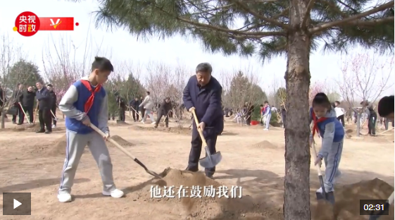 植樹期間,習(xí)近平詢問孩子們的學(xué)習(xí)生活和勞動鍛煉情況,并同在場的干部群眾親切交談。