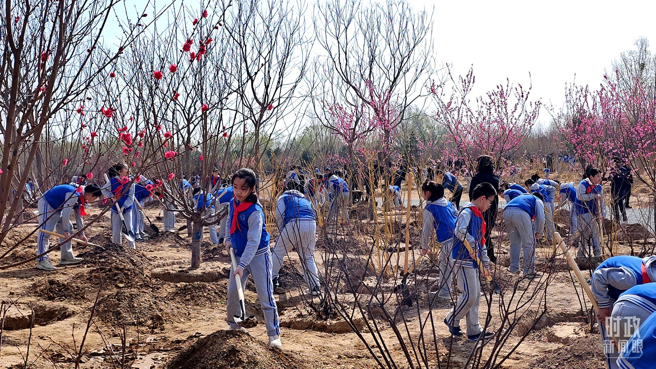 △永定河畔植樹點(diǎn),春意上枝頭。(總臺(tái)央視記者胡瑋、程鋮拍攝)