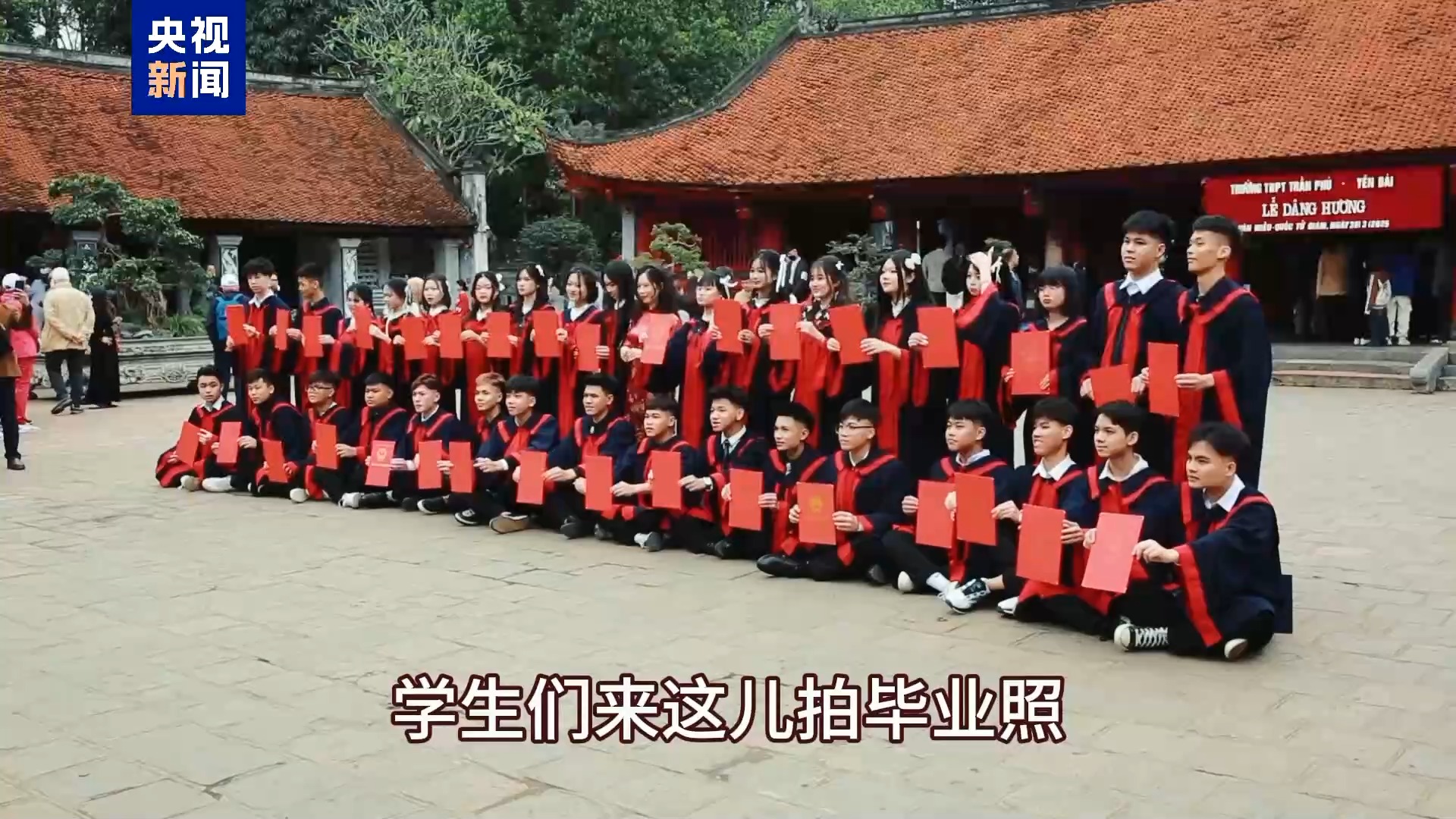 越南女學(xué)生:因?yàn)檫@里是一個(gè)神圣的地方,學(xué)生們來這兒拍畢業(yè)照,大家來文廟祭拜,希望能取得更好的學(xué)習(xí)成績。