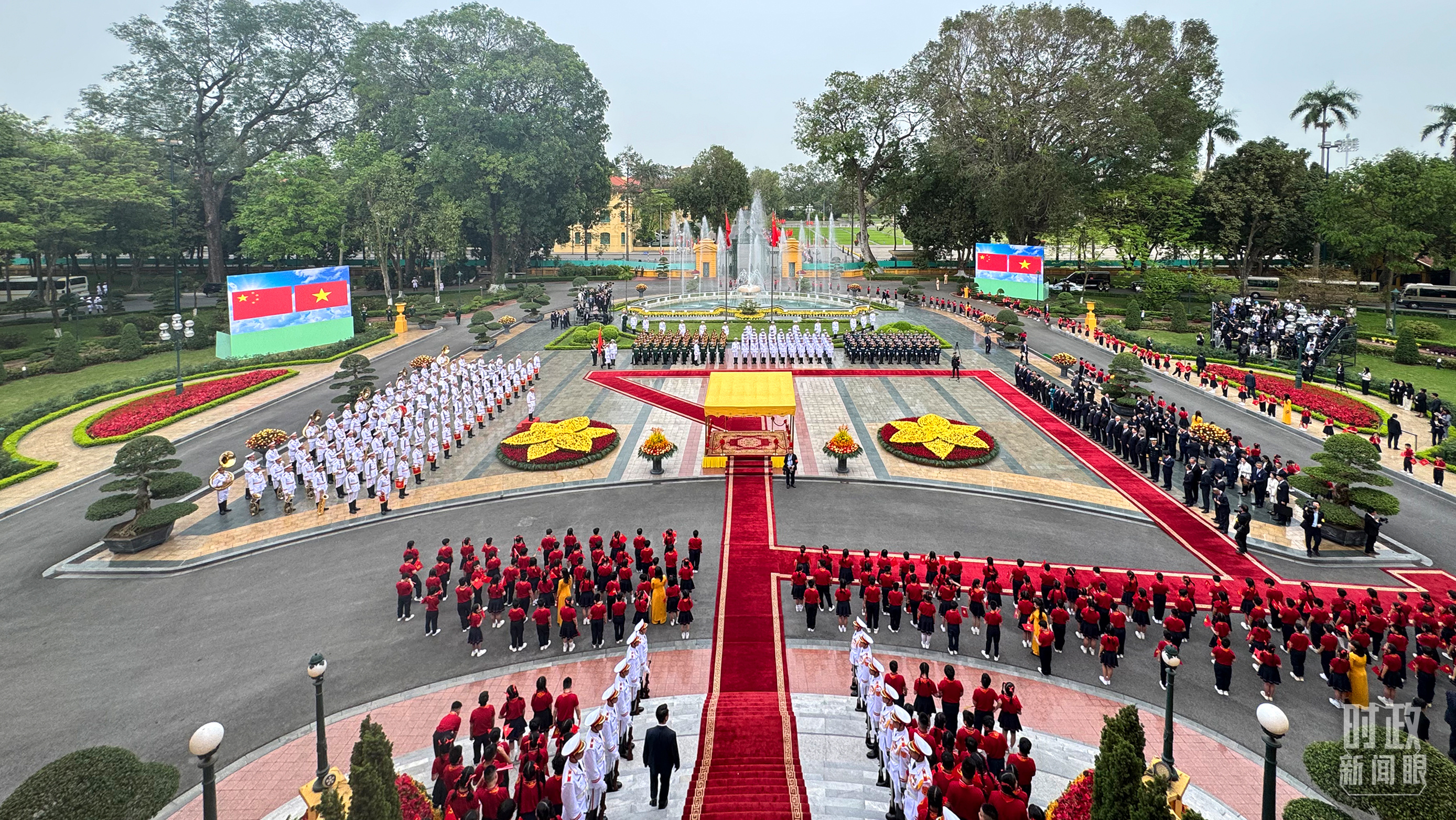 歡迎儀式上,200多名越南少年兒童揮舞旗幟,熱烈歡迎習(xí)近平總書記到訪。孩子們簇?fù)碇鴥牲h總書記合影留念。全體儀仗隊(duì)員在接受檢閱時(shí)用越南語高呼“祝總書記身體健康”。