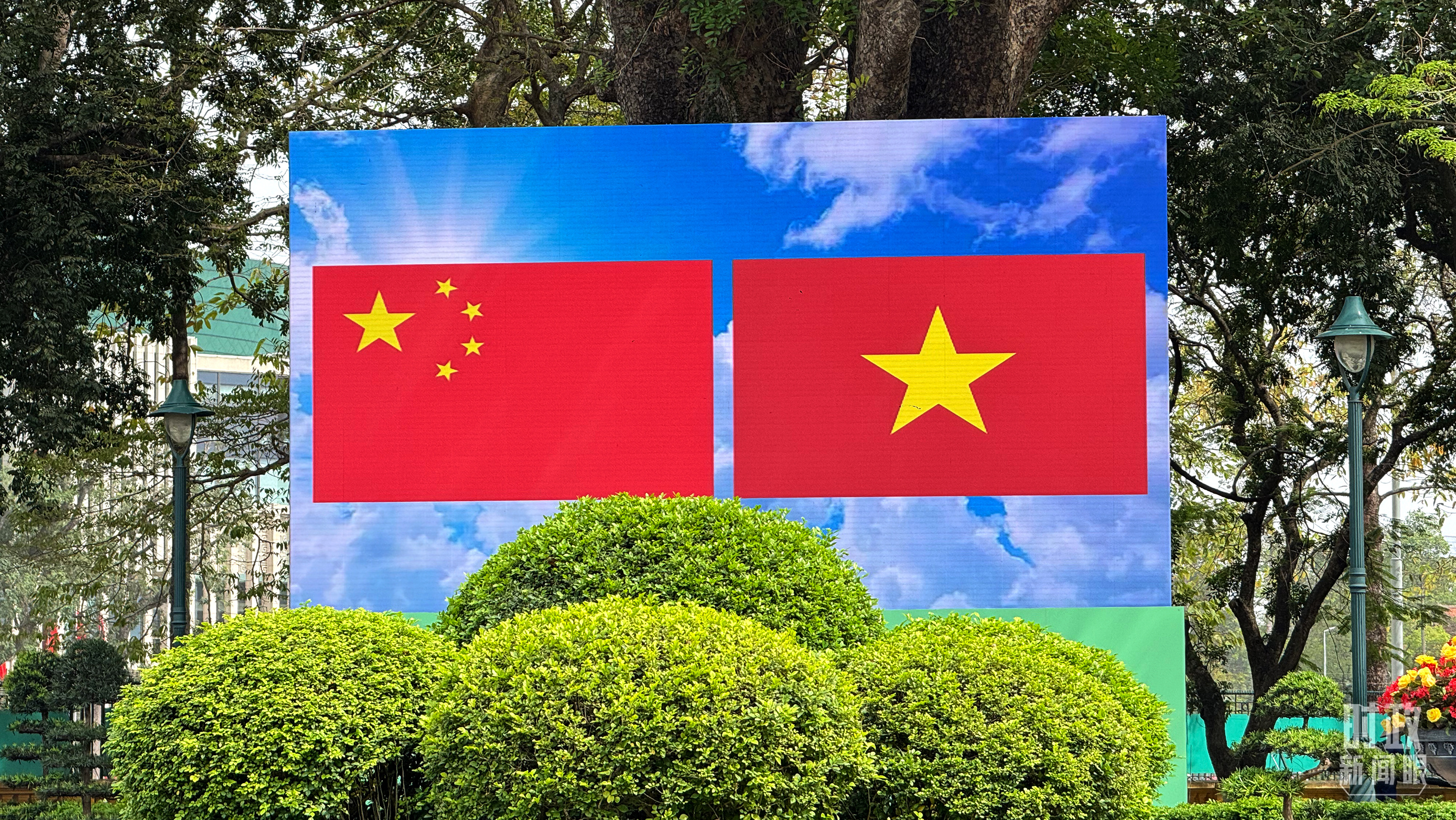 歡迎儀式現(xiàn)場大屏幕上展示的中越兩國國旗。(總臺(tái)央視記者蔣碩拍攝)