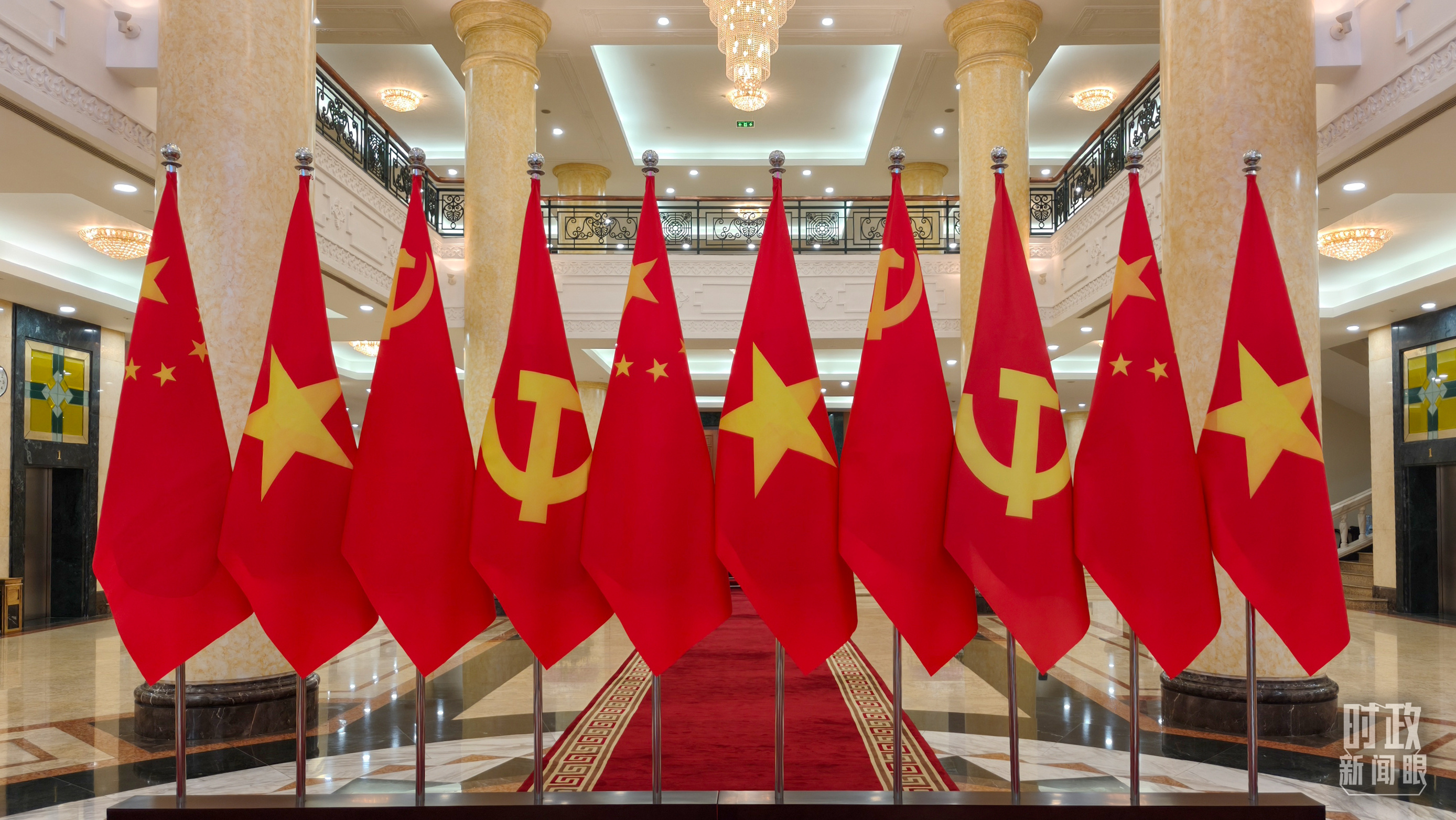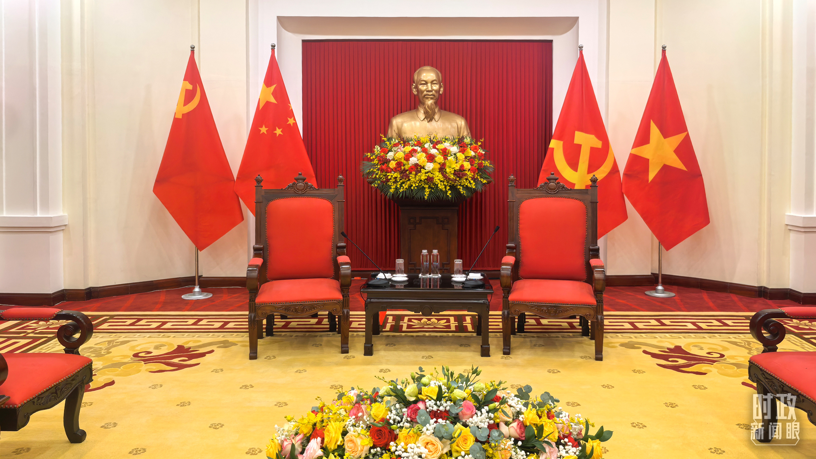 越共中央駐地?cái)[放的中越兩黨兩國旗幟。(總臺(tái)央視記者楊立峰拍攝)