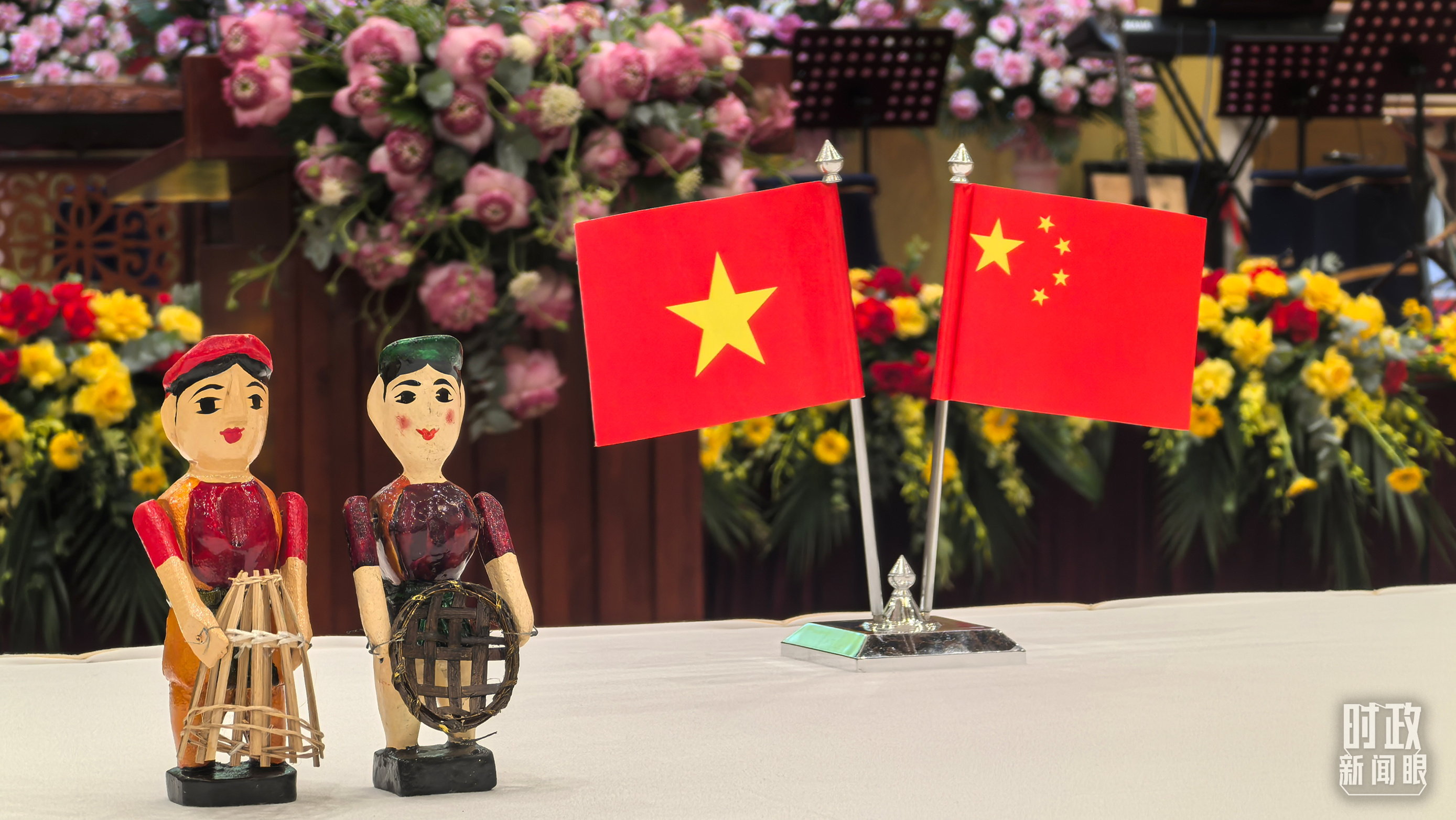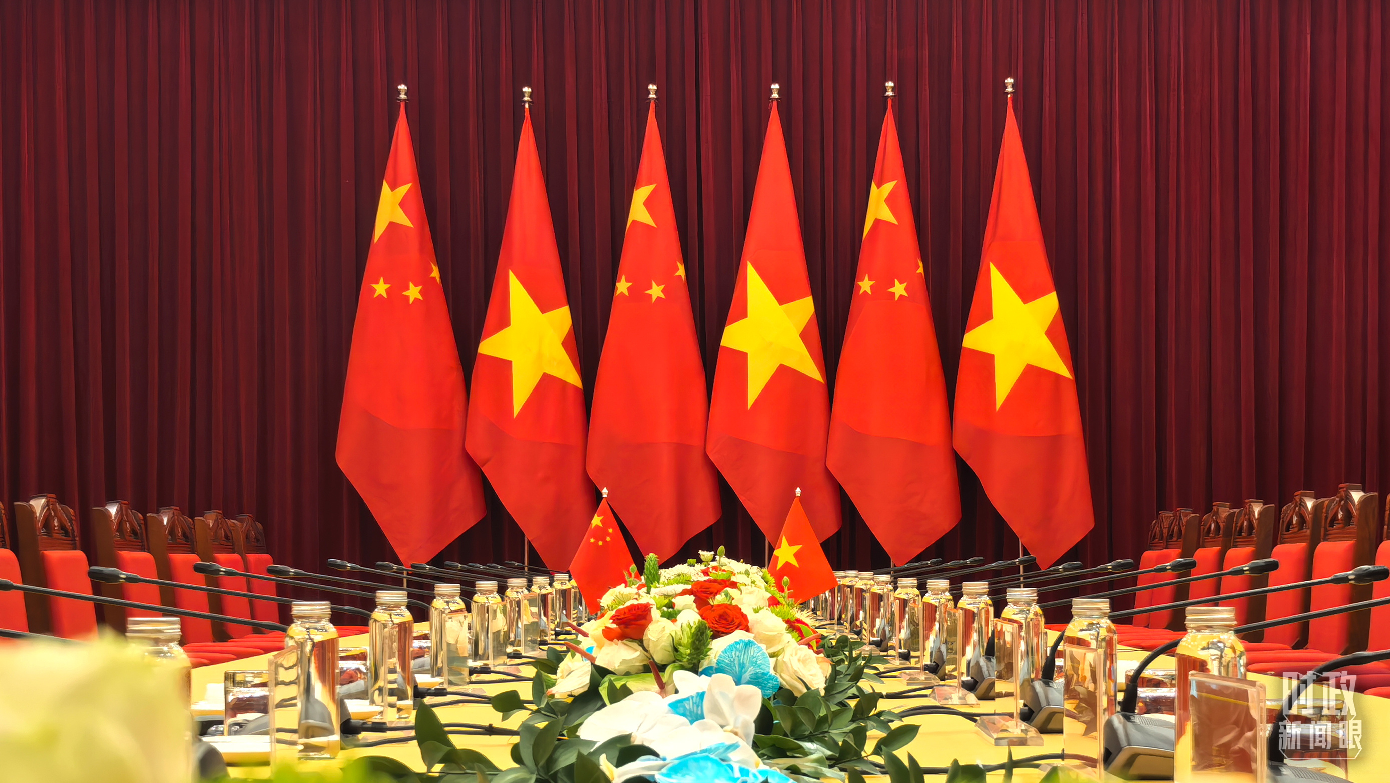 歡迎宴會(huì)現(xiàn)場擺放的中越兩國國旗。(總臺(tái)央視記者鄂介甫拍攝)