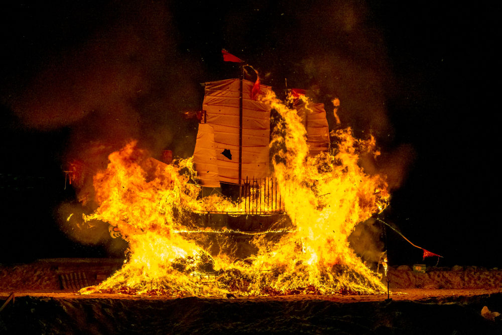 送王船是廣泛流傳于我國閩南地區(qū)和馬來西亞馬六甲沿海地區(qū)禳災(zāi)祈安的民俗活動。2020年,中國與馬來西亞聯(lián)合申報的“送王船——有關(guān)人與海洋可持續(xù)聯(lián)系的儀式及相關(guān)實踐”項目,被列入聯(lián)合國教科文組織人類非物質(zhì)文化遺產(chǎn)代表作名錄。這是2020年11月16日,在馬來西亞馬六甲,人們點燃“國安號”王船。