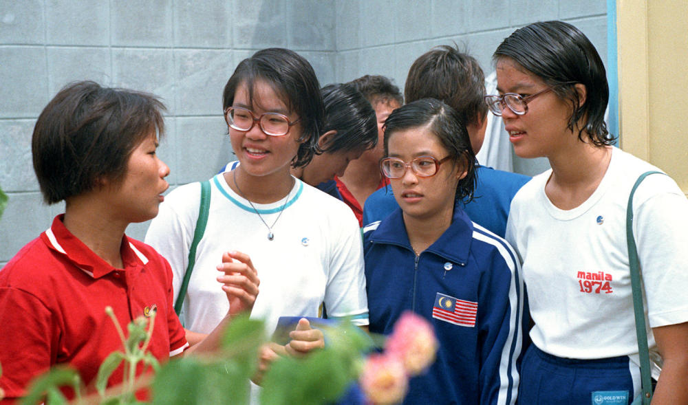 1975年8月2日至8月10日,北京國際游泳、跳水友好邀請賽舉行。一同參加這次邀請賽的馬來西亞游泳三姐妹林寶齡(前右二)、林愛齡(前右一)、林勇齡(左二)和中國運動員葉玩嫦親切交談。