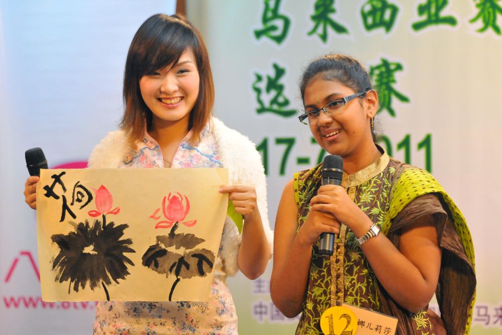 2011年7月17日,參加世界中學(xué)生中文比賽馬來西亞賽區(qū)比賽的選手馬雅司(左)展示自己創(chuàng)作的水墨畫。