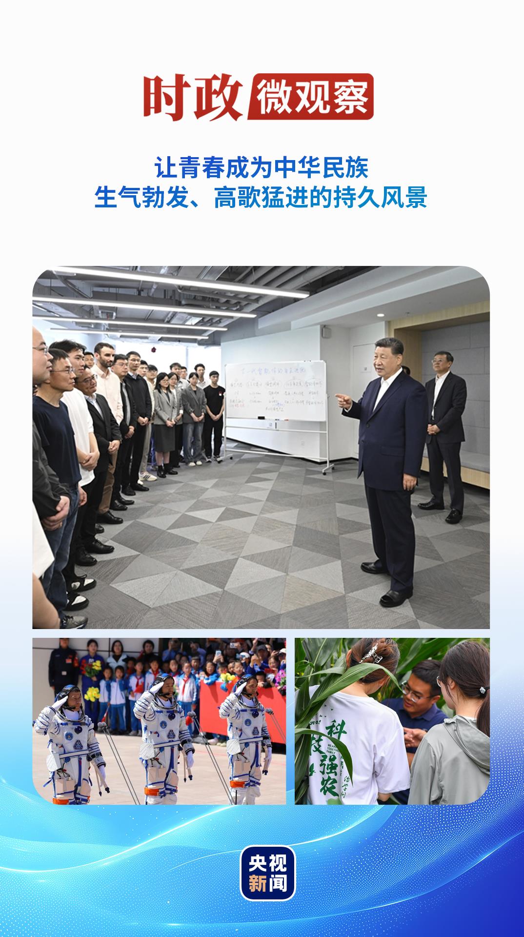 今年五四青年節(jié)前,習近平總書記再次來到年輕人中間。4月29日,在上?!澳K倏臻g”大模型創(chuàng)新生態(tài)社區(qū),總書記同青年創(chuàng)新人才親切交流,勉勵大家“把個人奮斗同國家前途命運緊緊聯(lián)系在一起,跑好歷史的接力棒,在推進中國式現(xiàn)代化的寬廣舞臺上綻放絢麗的青春光彩”。