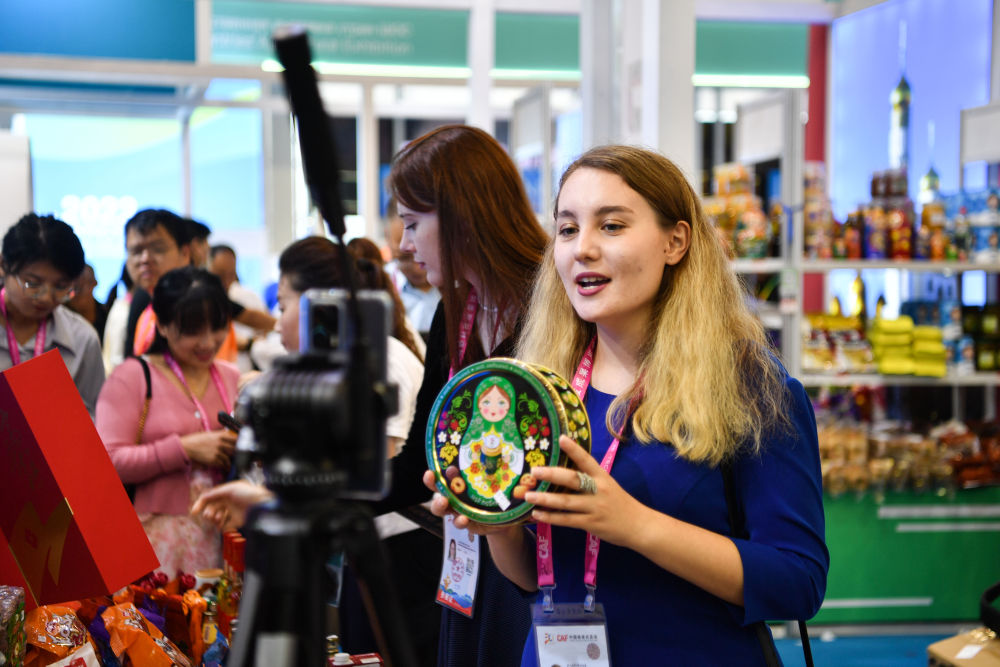 2023年9月19日,來自俄羅斯的參展商在陜西楊凌農高會展臺進行直播。