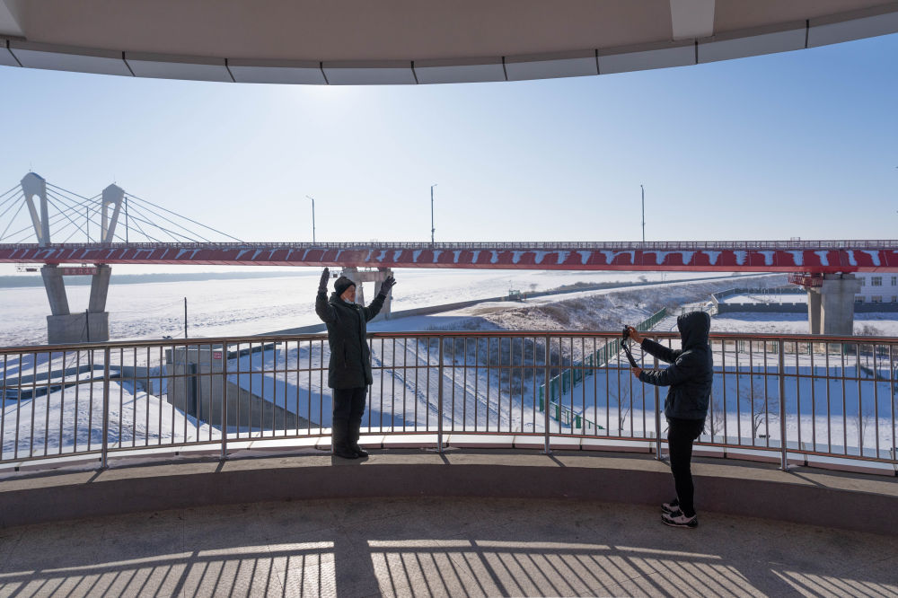 2024年1月30日,游客在黑龍江省黑河市黑龍江大橋公園內的觀光塔上留影。黑河—布拉戈維申斯克黑龍江大橋于2022年6月10日正式通車,是中俄首座跨黑龍江(俄羅斯稱阿穆爾河)界河公路橋,在中國東北地區(qū)和俄羅斯遠東地區(qū)之間開辟了新的國際運輸通道。