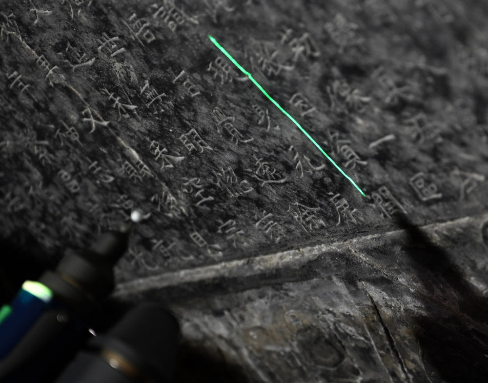 2025年4月9日,龍門石窟研究院工作人員在古陽洞使用關(guān)節(jié)臂掃描儀對(duì)《龍門二十品》之一進(jìn)行數(shù)字化掃描。新華社記者 李嘉南 攝