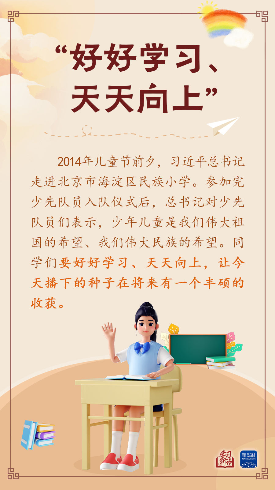 讓孩子們成長得更好,習近平總書記始終牽掛于心。本期“學習新語”,我們擷取總書記關(guān)心少年兒童健康成長的一些場景,感悟總書記對“祖國花朵”的真摯關(guān)懷和殷切期望。