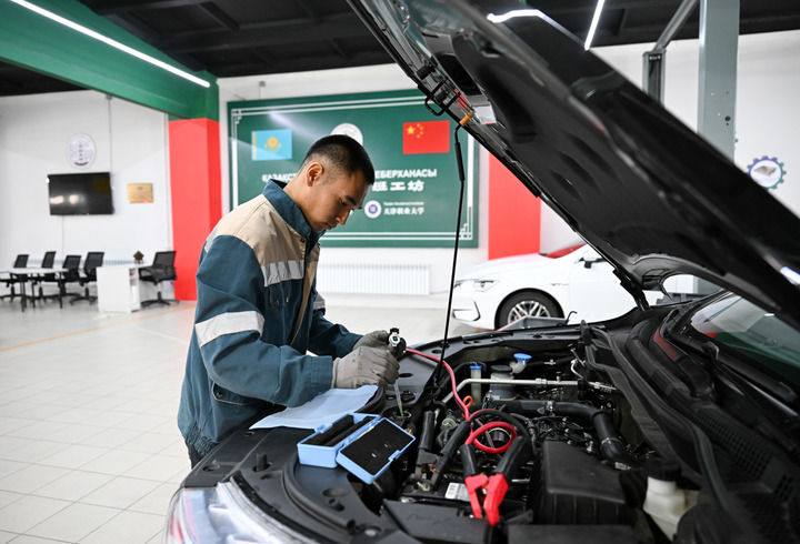 2025年5月9日,在哈薩克斯坦東哈薩克斯坦州首府厄斯克門(mén)的魯班工坊,學(xué)員練習(xí)汽車(chē)檢修技能。新華社記者 李任滋 攝