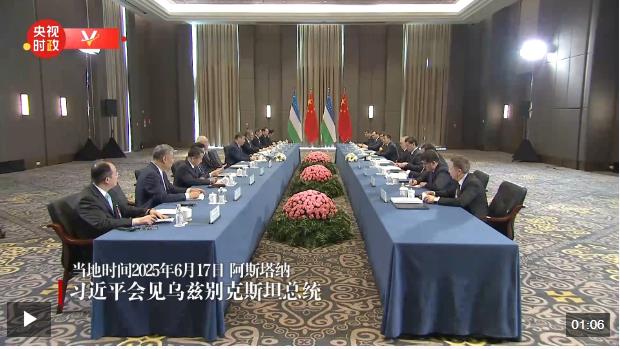 當?shù)貢r間6月17日上午,國家主席習近平在阿斯塔納出席第二屆中國-中亞峰會期間會見烏茲別克斯坦總統(tǒng)米爾濟約耶夫。