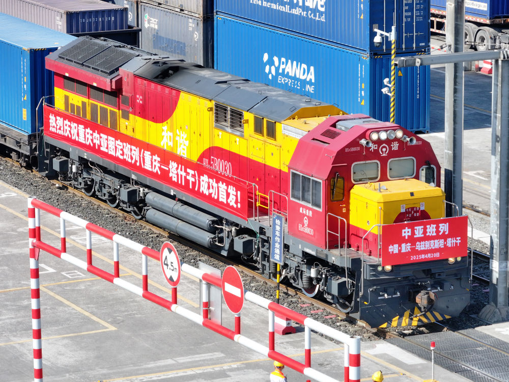 4月20日,圖定中亞班列在重慶團(tuán)結(jié)村中心站等候發(fā)車(無人機(jī)照片)。新華社記者 唐奕 攝