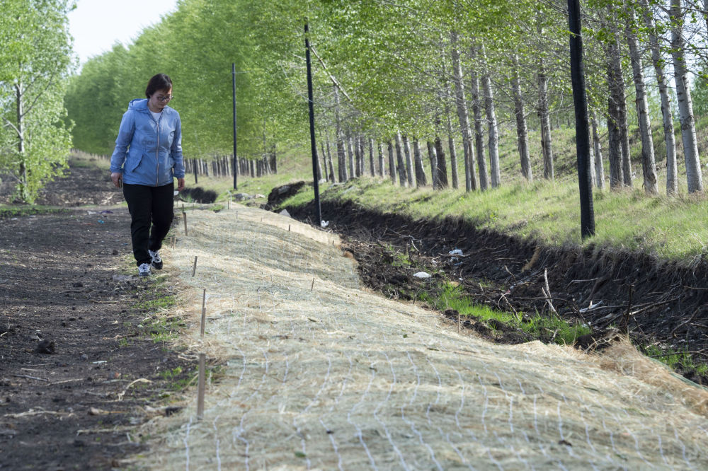 2022年5月23日,在黑龍江省海倫市前進鎮(zhèn)光榮村,黑龍江省農業(yè)科學院科研人員在進行坡面生態(tài)修復的黑土坡耕地中查看治理情況。