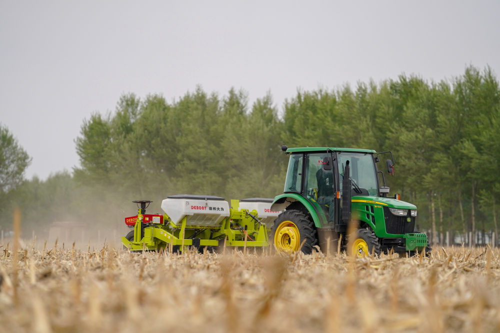 經過多年試驗和推廣,東北逐步形成以秸稈覆蓋、少耕免耕為特點的吉林“梨樹模式”等多種行之有效的保護性耕作模式。這是2020年5月7日,吉林省四平市梨樹縣的農民駕駛免耕播種機播種玉米。